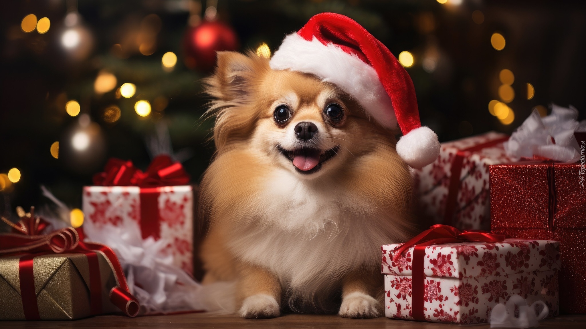 Edytor tapety: Chihuahua w czapce Mikołaja wśród prezentów