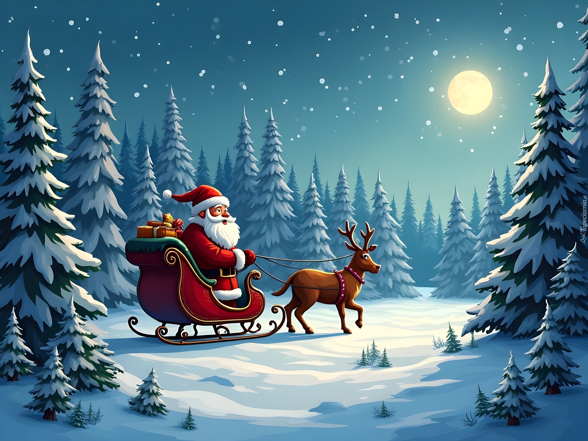 Edytor tapety: Zaprzęg Mikołaja w zimowym lesie w blasku księżyca