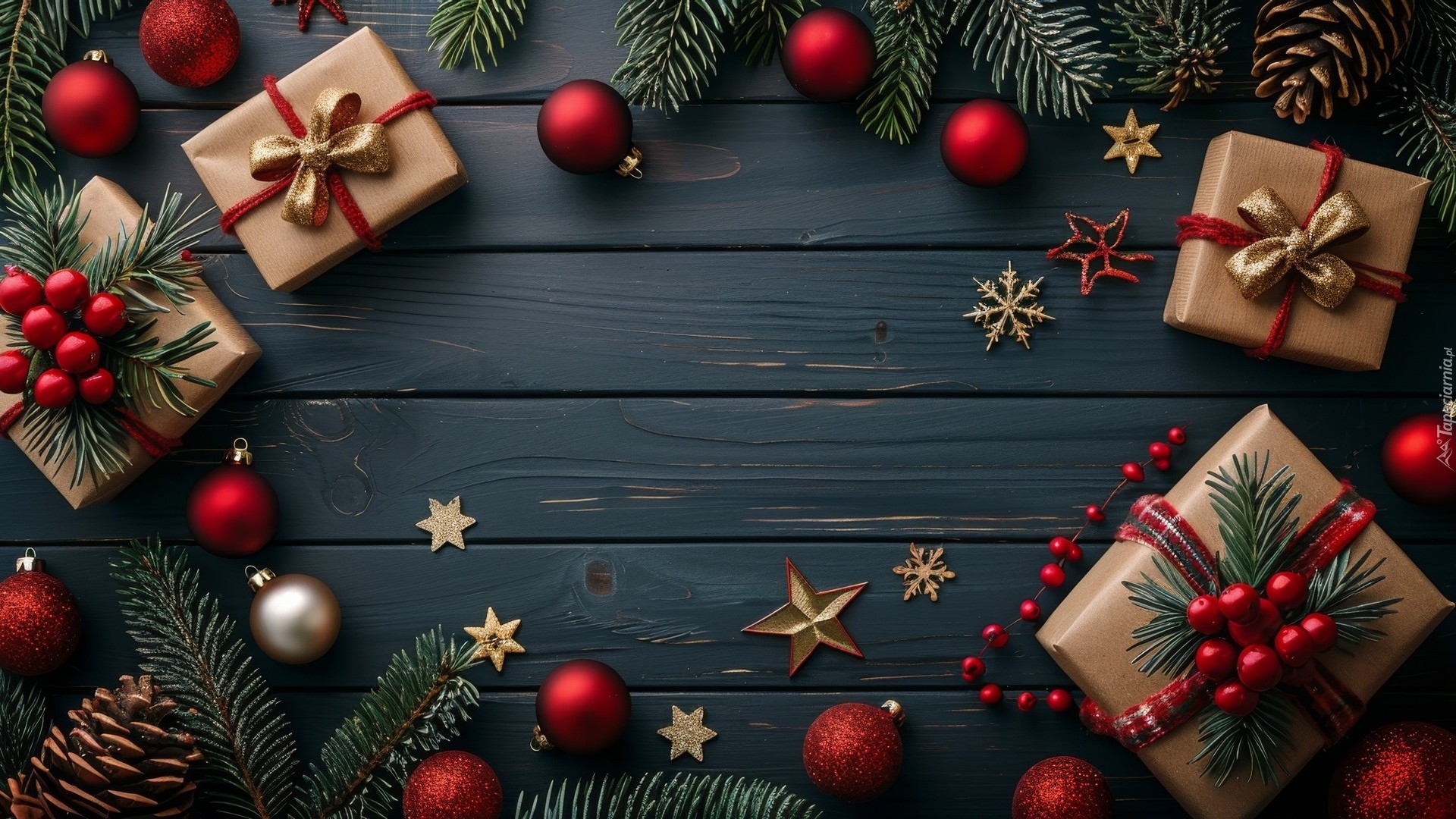 Edytor tapety: Prezenty bombki i gałązki na ciemnych deskach