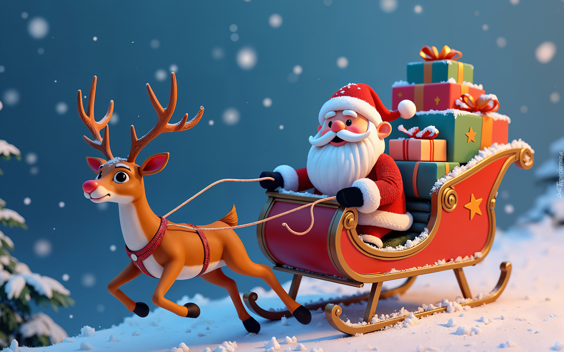 Edytor tapety: Renifer ciągnący sanie z Mikołajem i prezentami