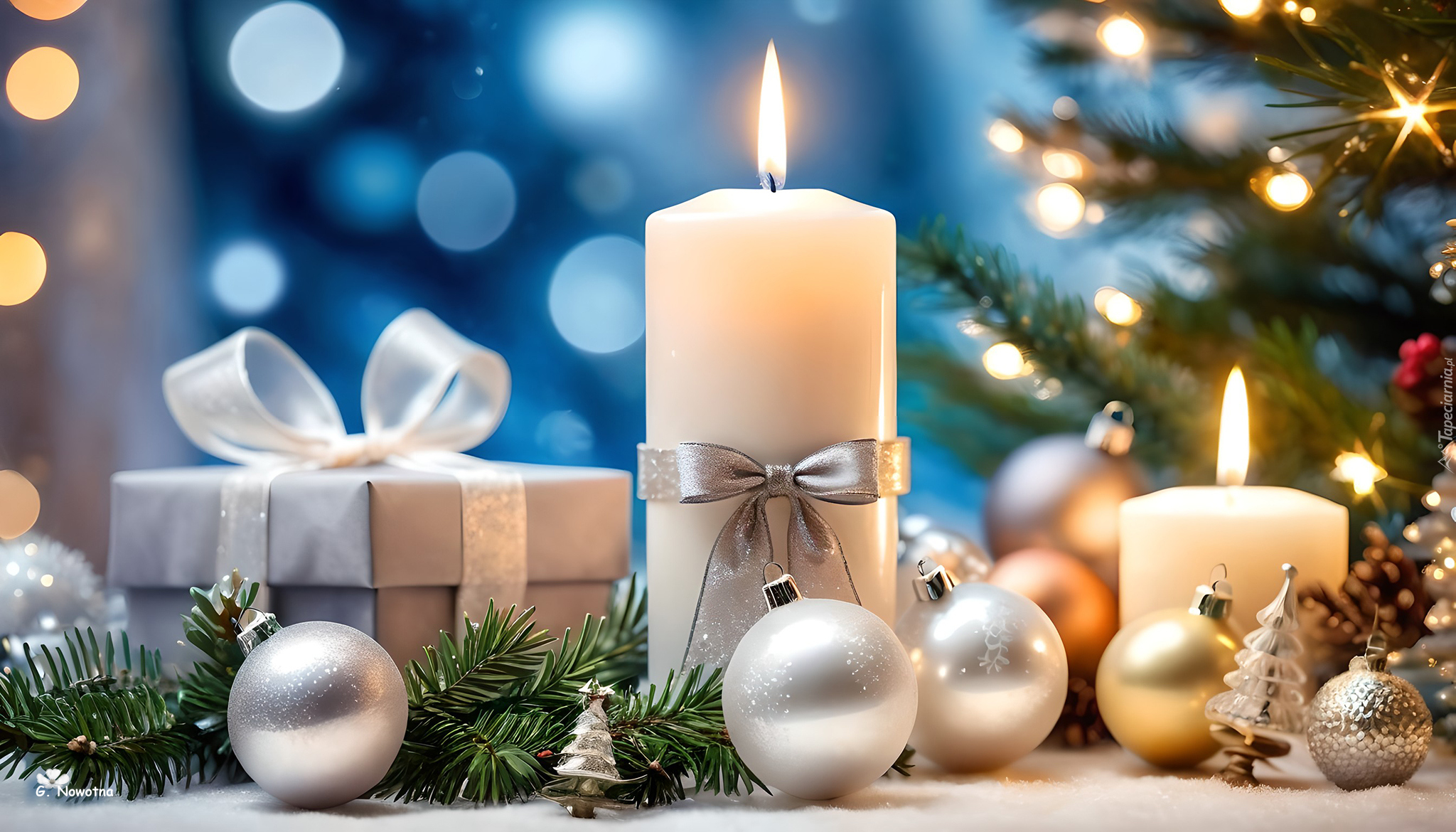 Edytor tapety: Zapalone świece obok bombek i prezentów przy choince
