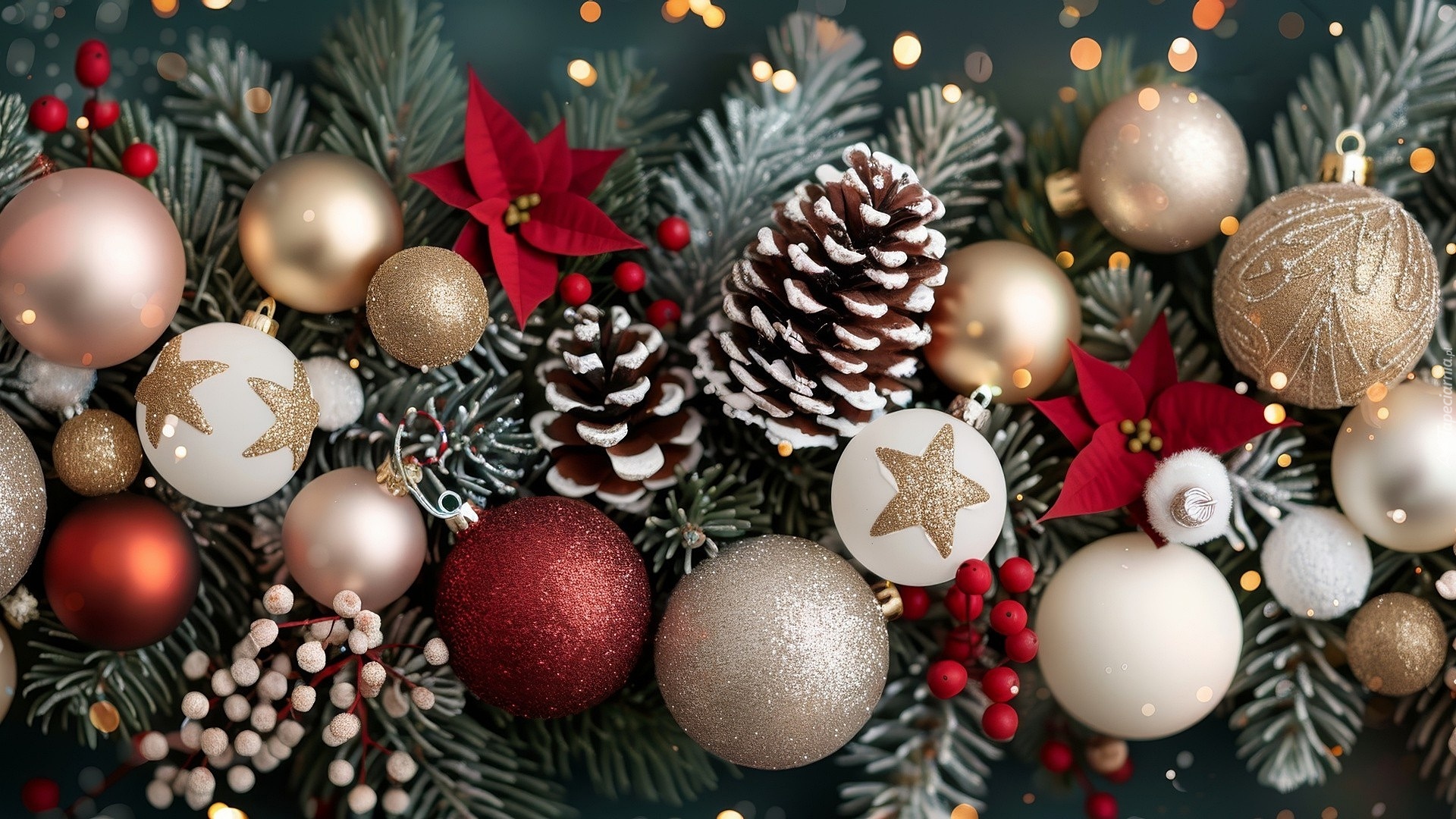 Edytor tapety: Kolorowe bombki i szyszki na iglastych gałązkach