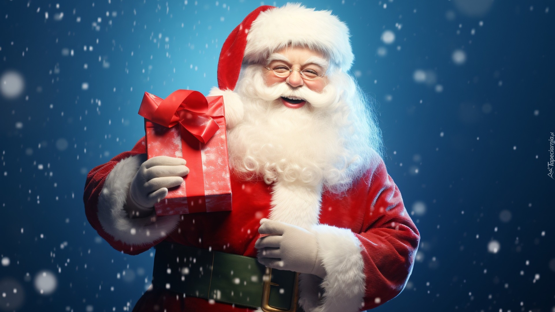 Edytor tapety: Uśmiechnięty Mikołaj z prezentem w ręce