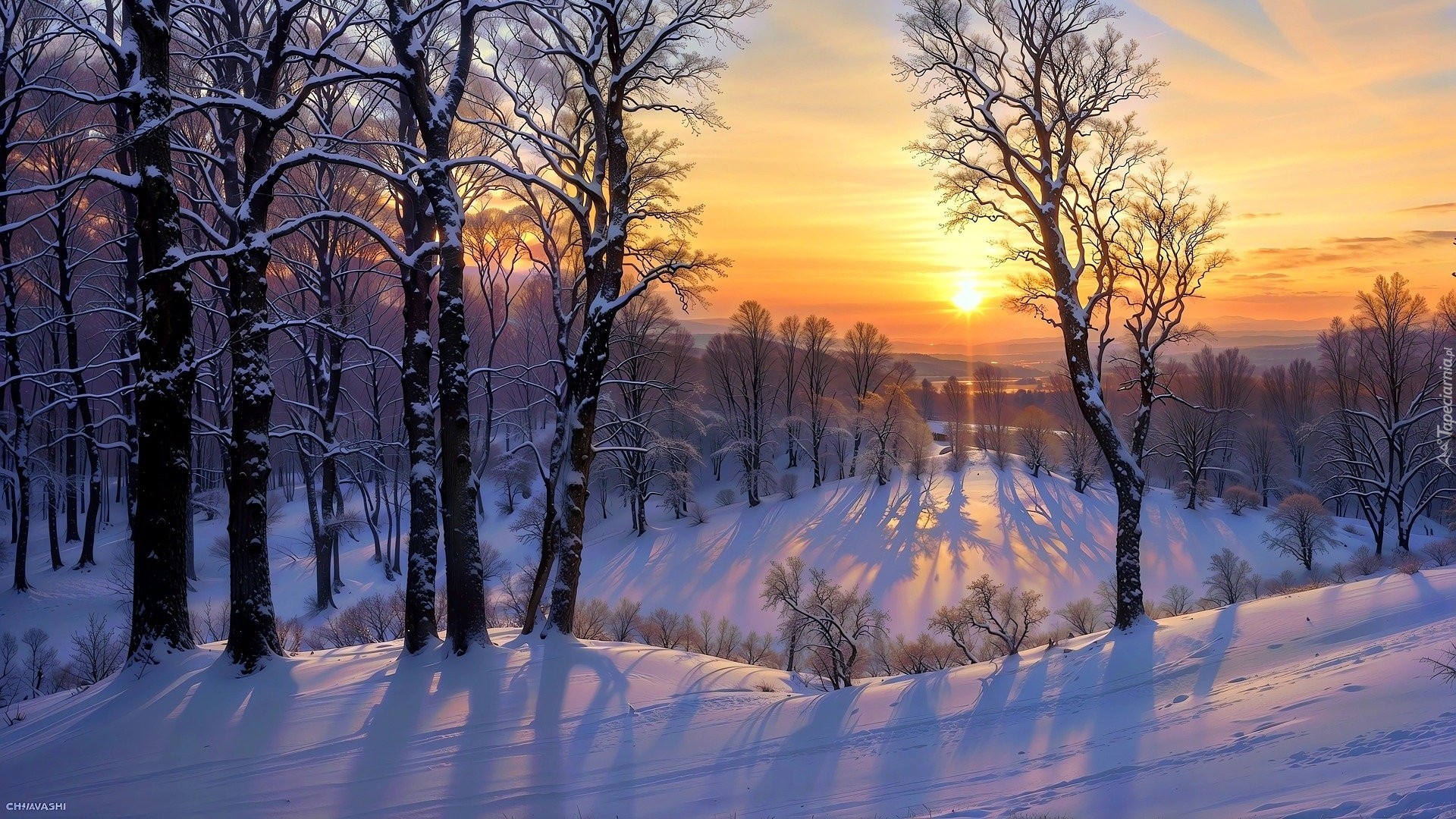 Edytor tapety: Zachód słońca nad ośnieżonymi drzewami na wzgórzu