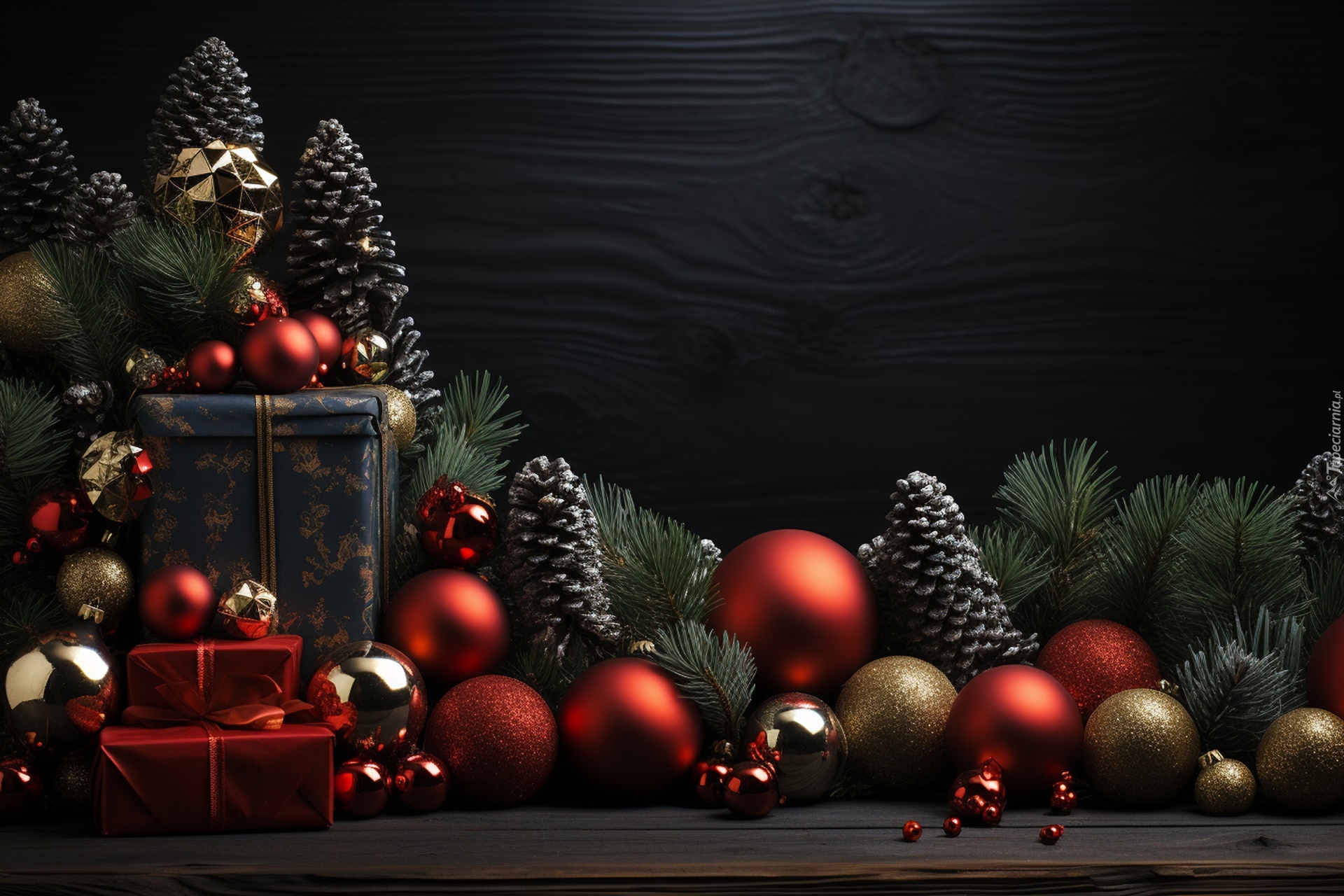 Edytor tapety: Kolorowe bombki i szyszki oraz gałązki obok prezentów