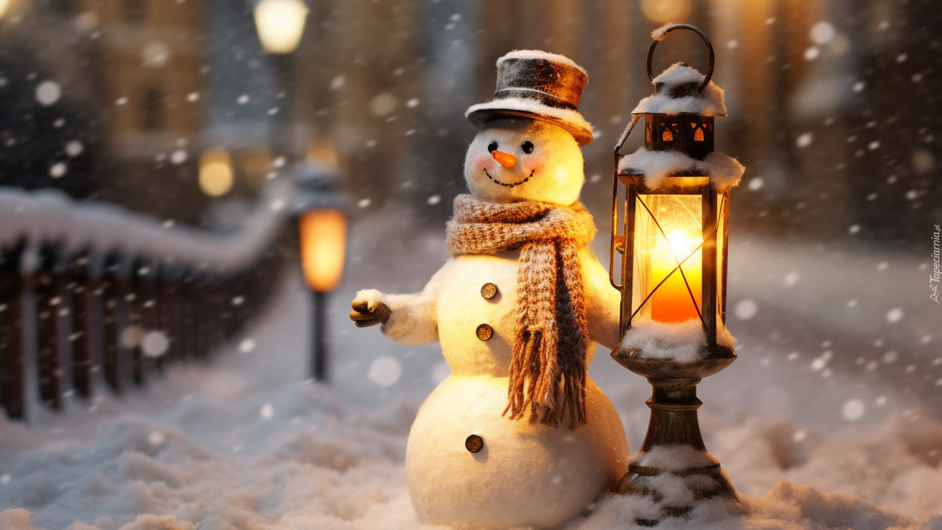 Edytor tapety: Bałwan w kapeluszu i szaliku obok ośnieżonej lampy
