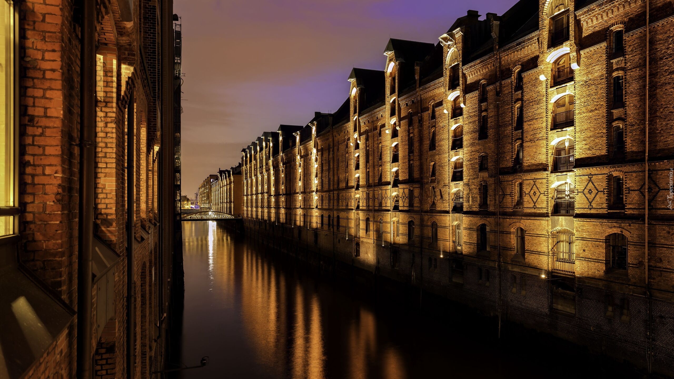Edytor tapety: Oświetlone domy nad kanałem w Hamburgu