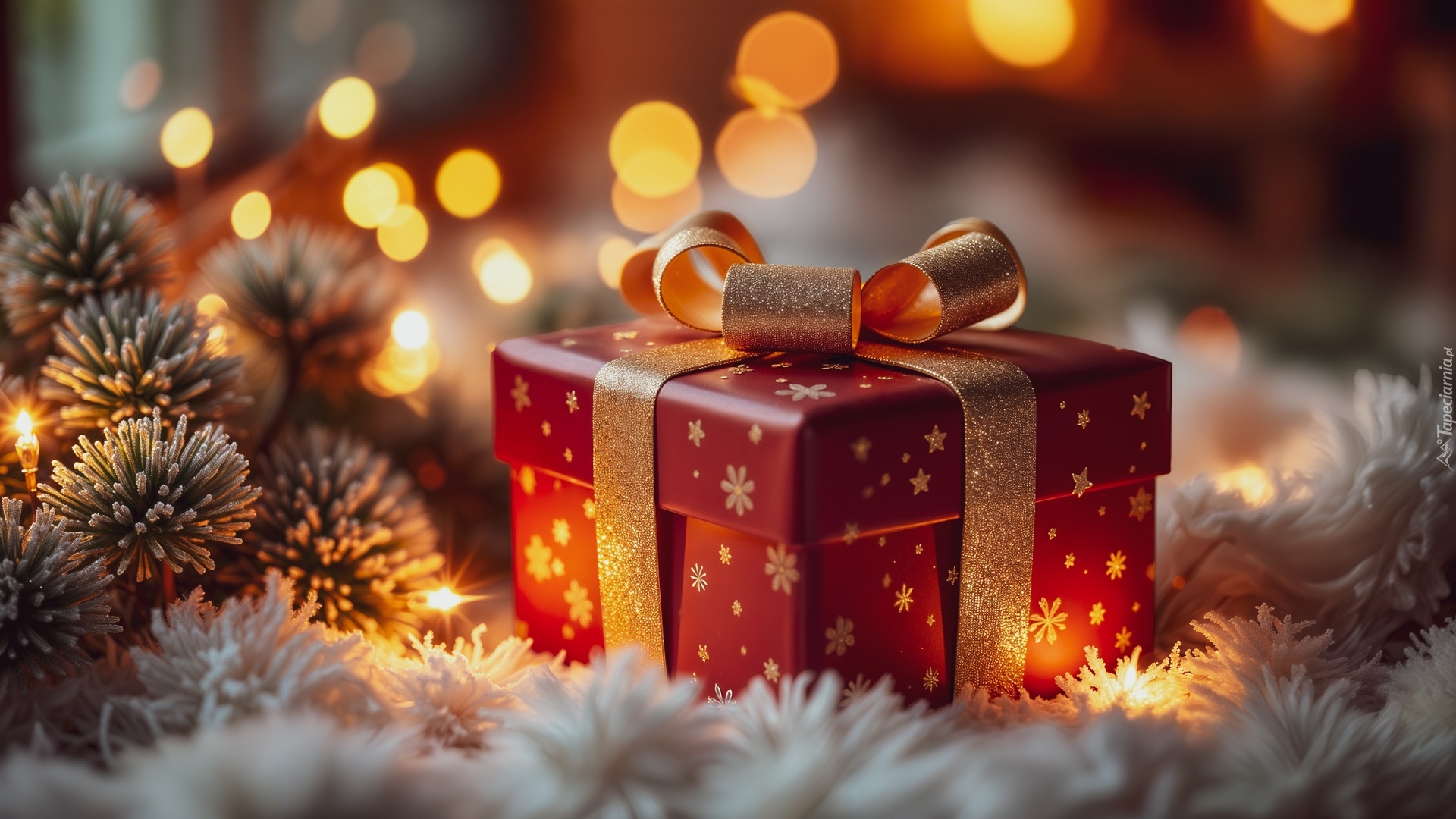 Edytor tapety: Prezent z kokardą obok światełek i gałązek iglastych