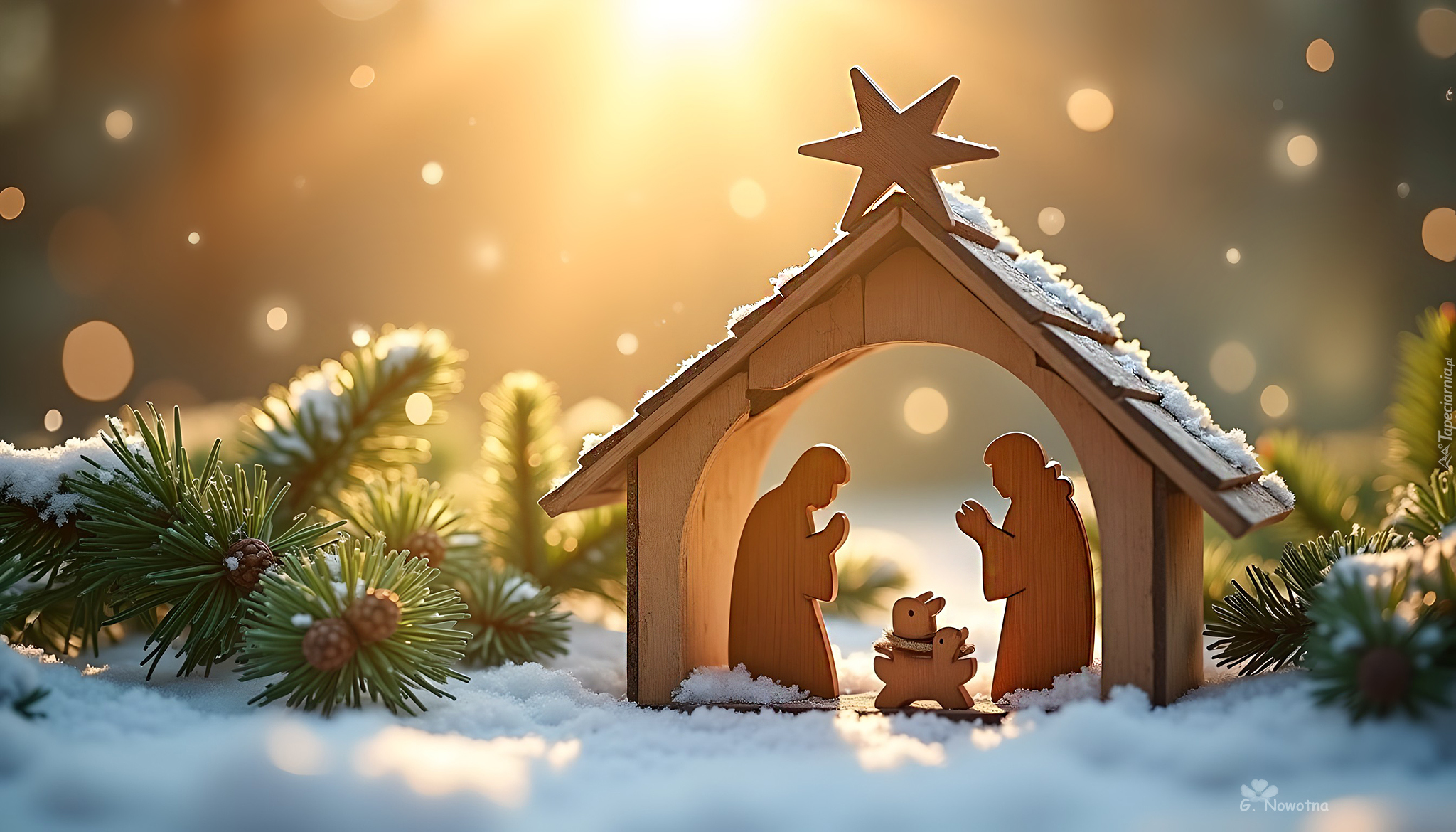 Edytor tapety: Drewniany żłóbek na śniegu obok gałązek