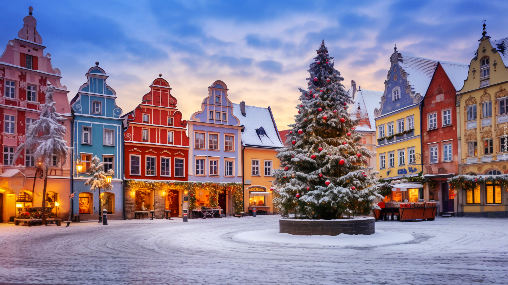 Edytor tapety: Udekorowana choinka na rynku miasta zimową porą