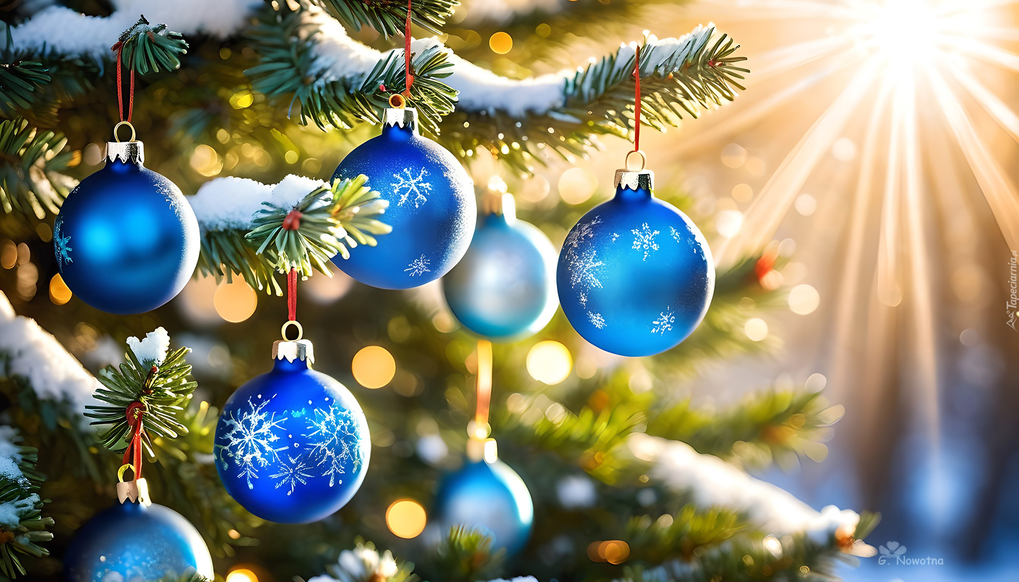 Edytor tapety: Rozświetlone promieniami słońca niebieskie bombki na ośnieżonych gałązkach