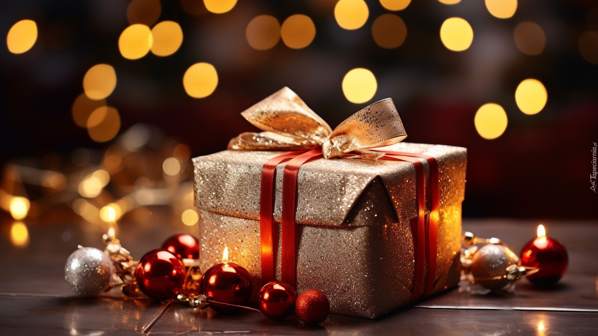 Edytor tapety: Bombki i świece obok pudełka z prezentem