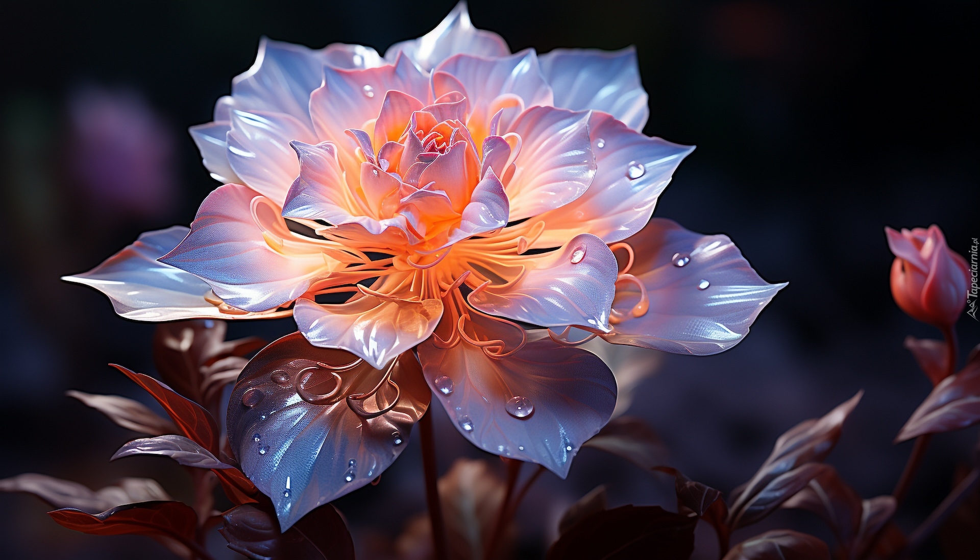 Edytor tapety: Krople na rozświetlonym i rozkwitniętym kwiatku w grafice