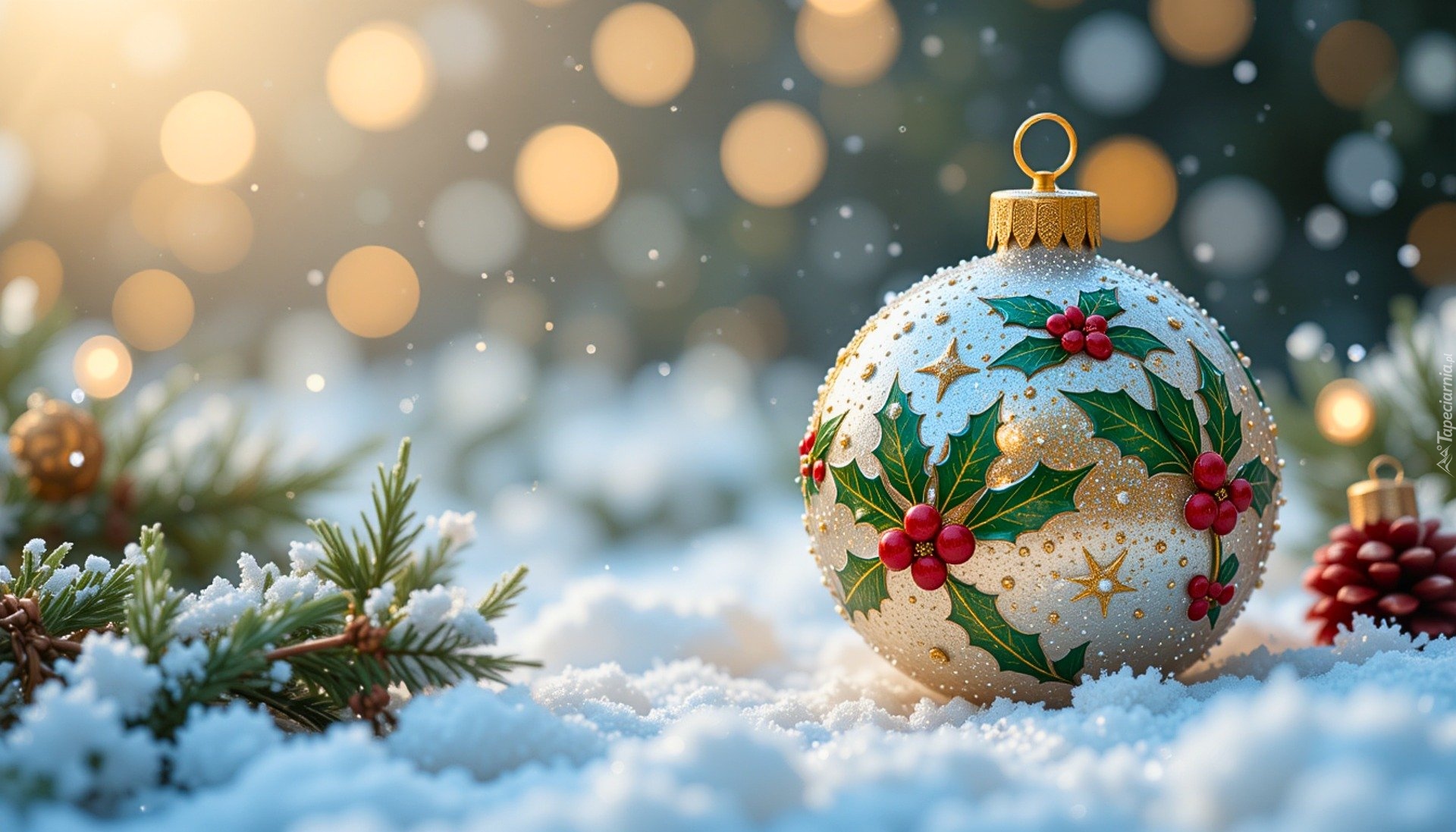 Edytor tapety: Ozdobna bombka obok gałązek na śniegu