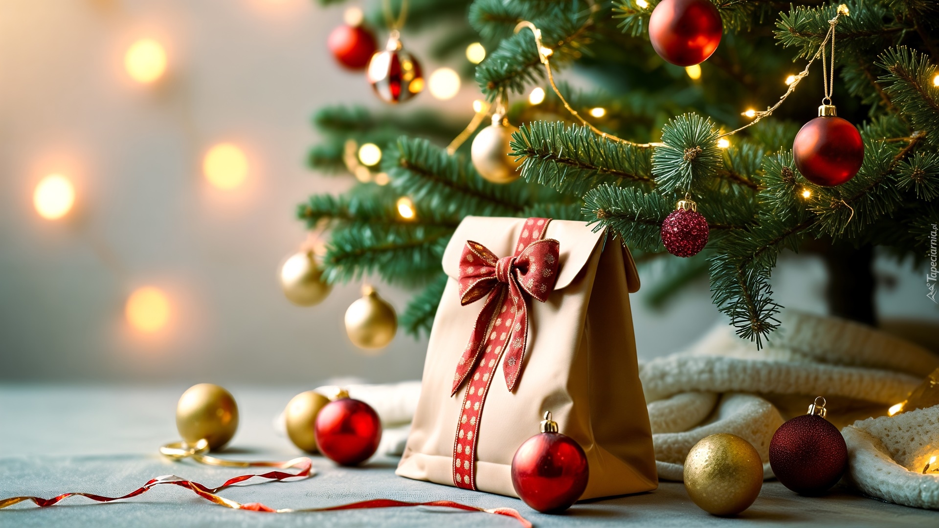 Edytor tapety: Torba z prezentem i bombki pod udekorowaną choinką