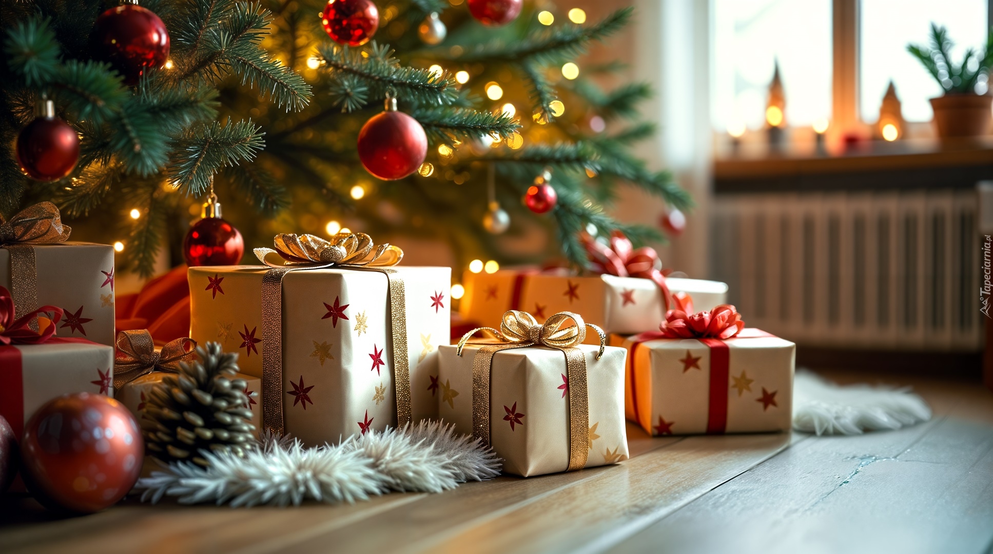 Edytor tapety: Prezenty pod udekorowaną choinką obok okna