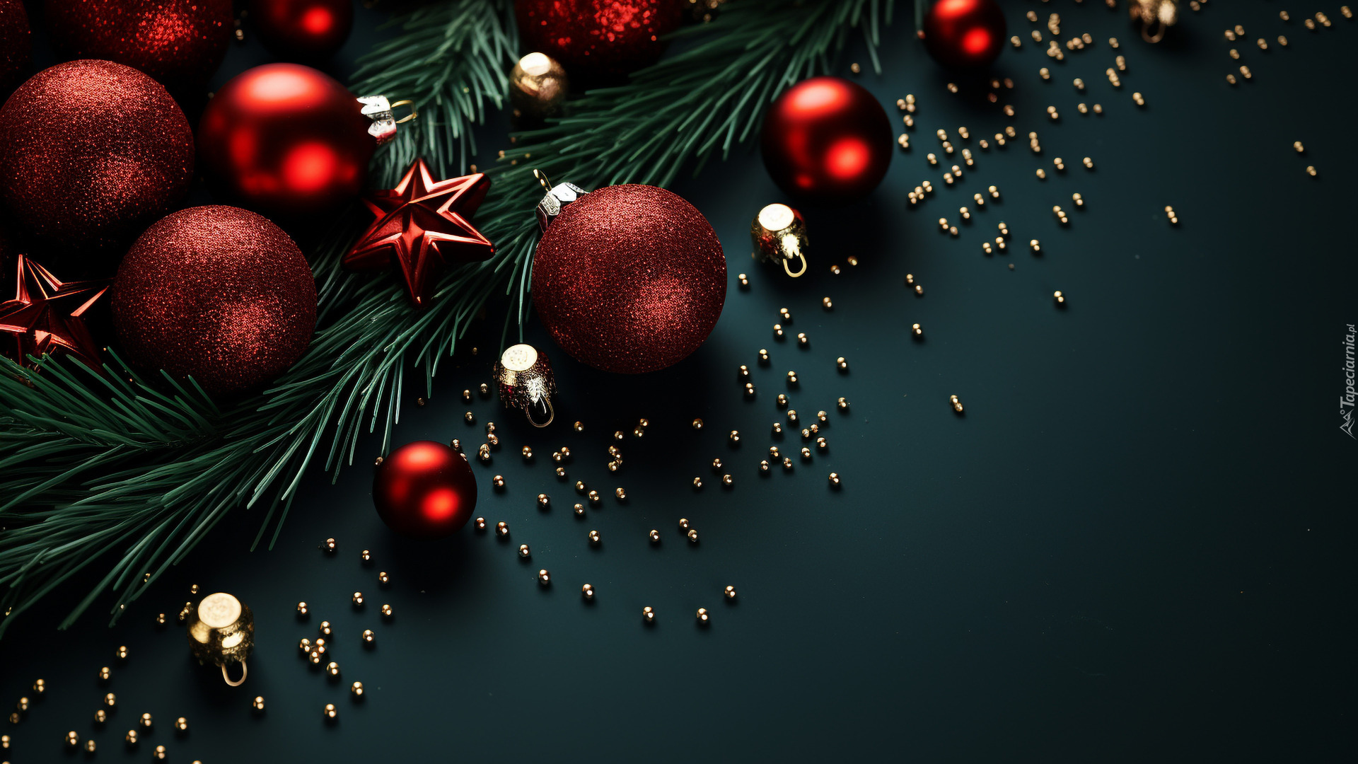 Edytor tapety: Czerwone bombki i koraliki obok zielonej gałązki