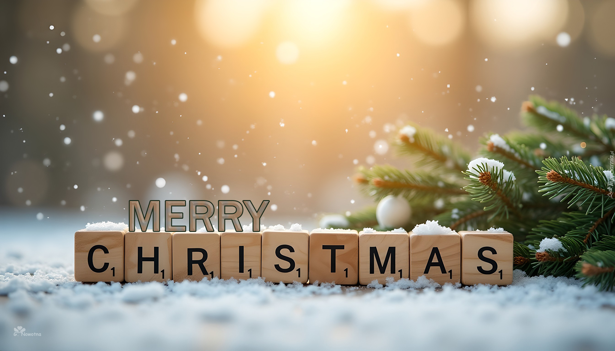 Edytor tapety: Drewniane klocki z życzeniami świątecznymi obok gałązek świerkowych