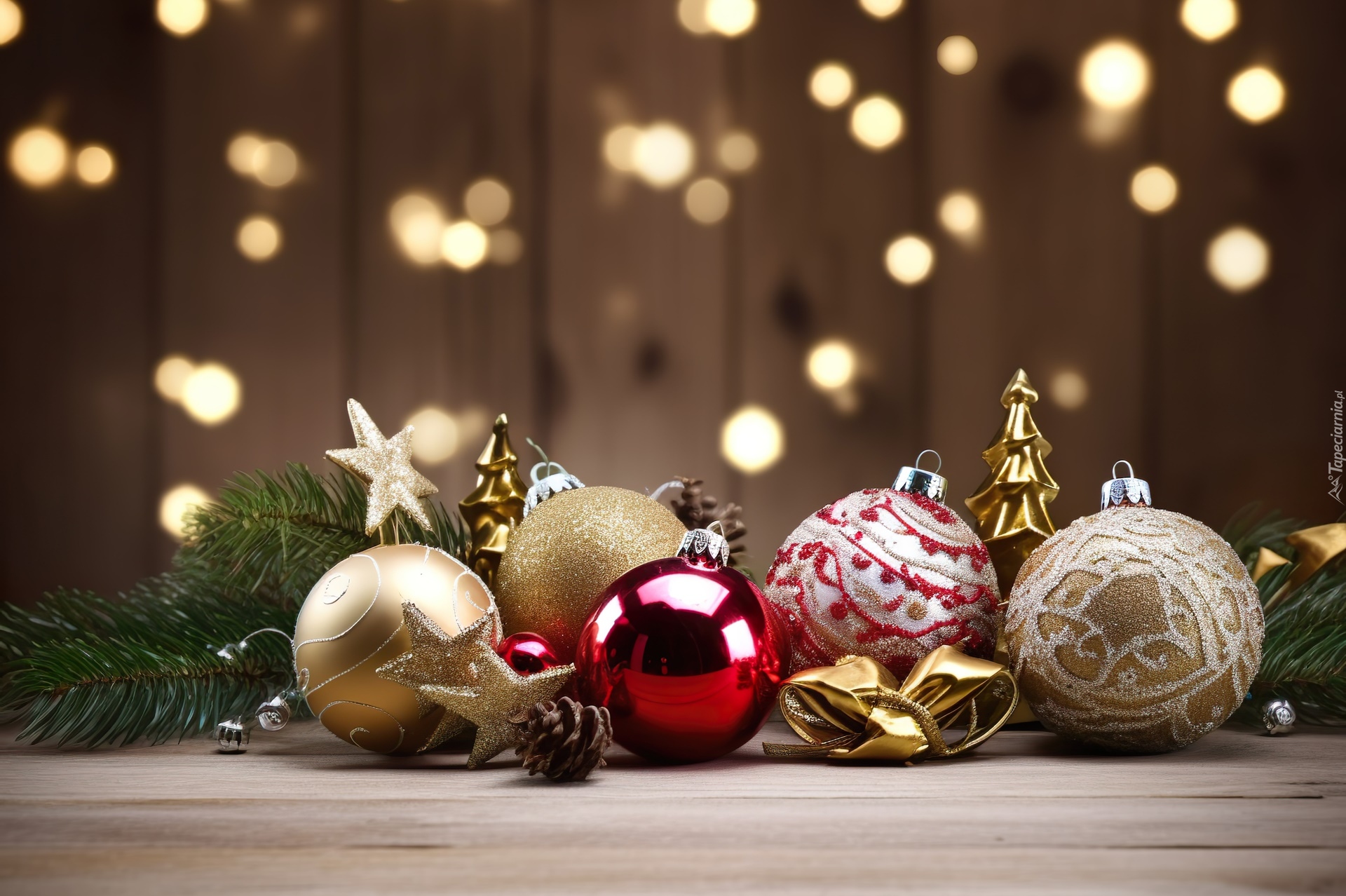 Edytor tapety: Ozdobne bombki z gałązkami na tle światełek