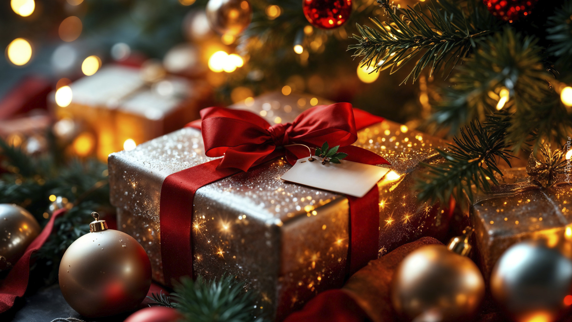 Edytor tapety: Prezent i bombki leżące pod udekorowaną choinką