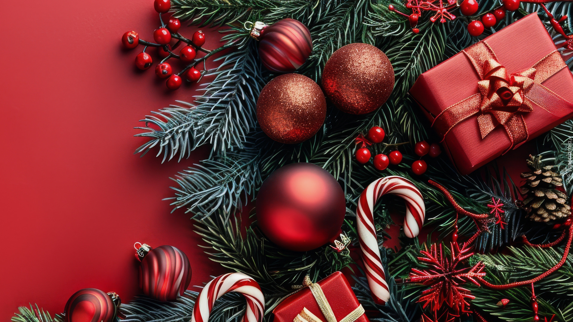 Edytor tapety: Czerwone bombki i prezenty na gałązkach świerkowych