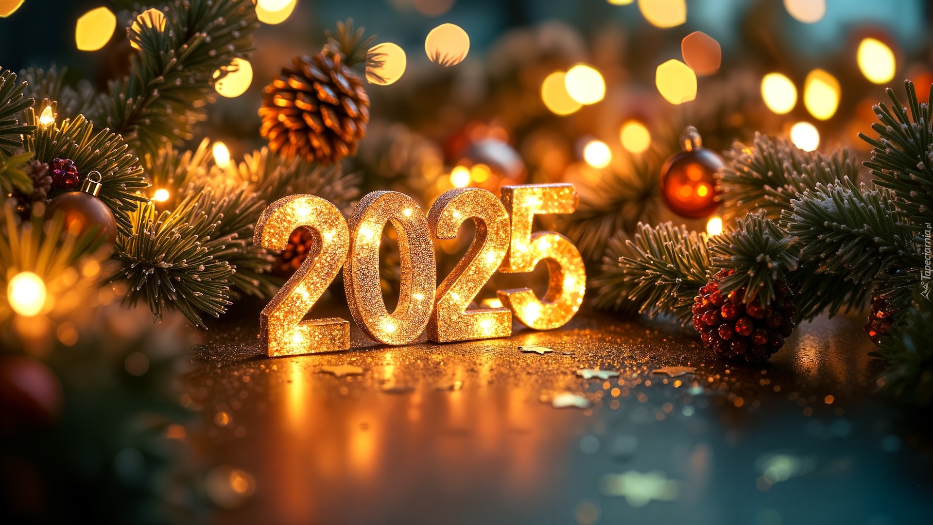 Edytor tapety: Cyfry 2025 obok rozświetlonych gałązek świerkowych z szyszkami