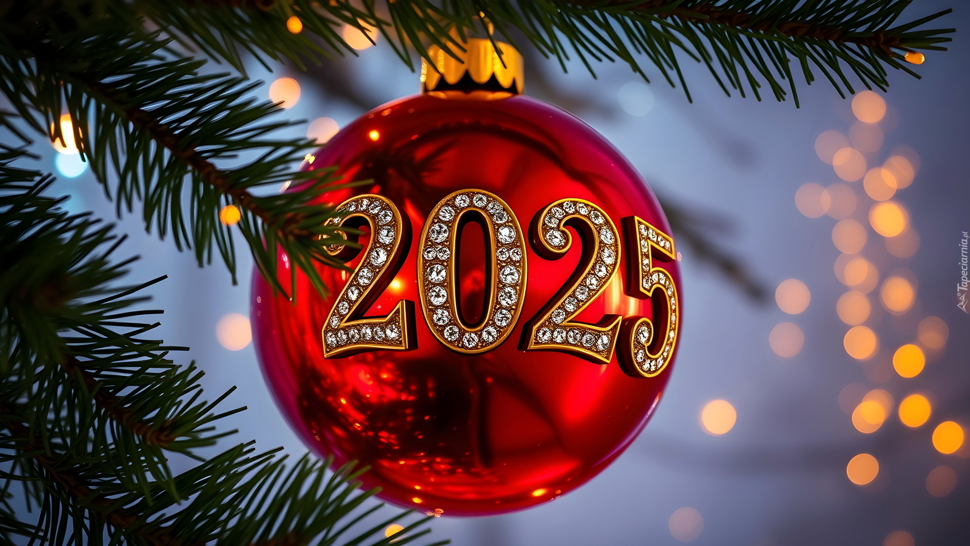 Edytor tapety: Czerwona bombka z datą 2025 na gałązce choinki