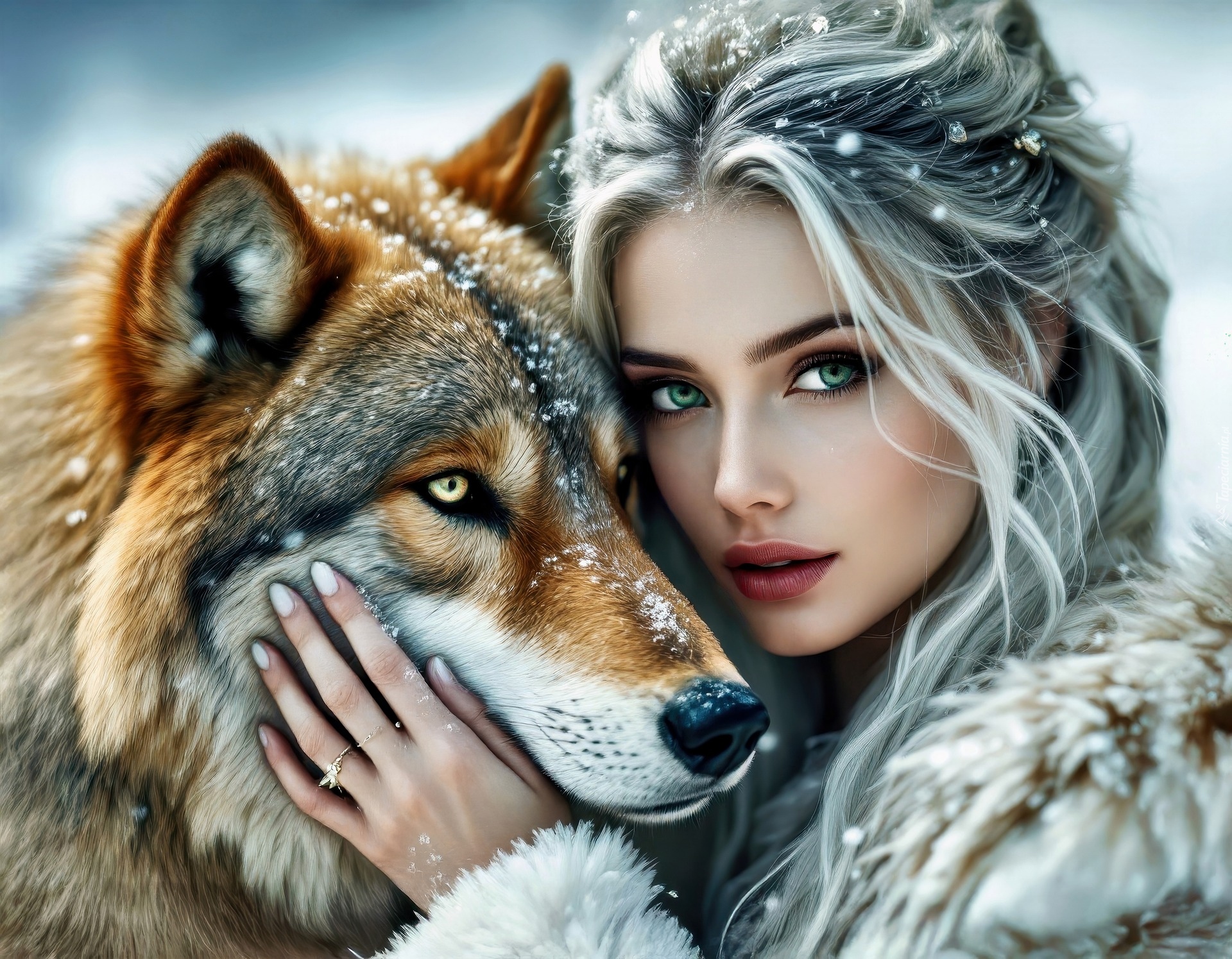 Edytor tapety: Twarz blondynki obok głowy wilka