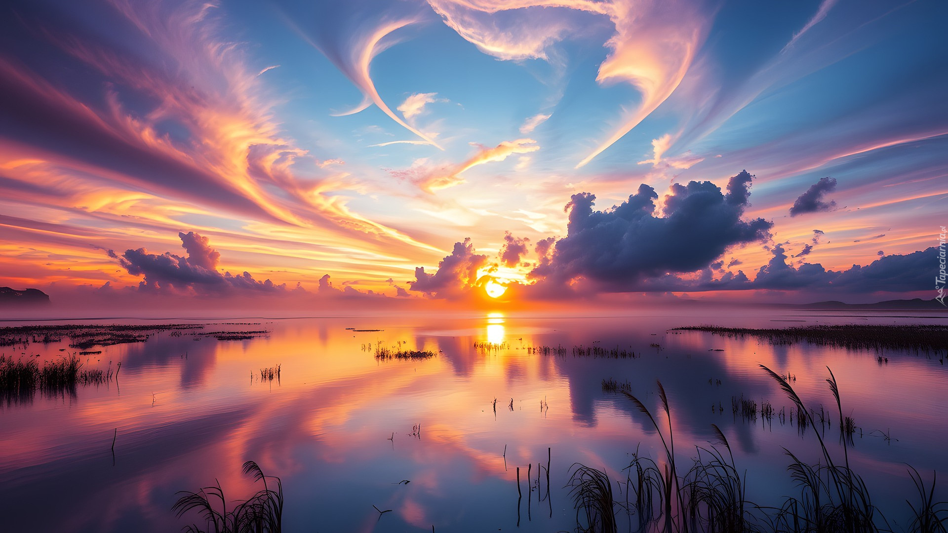 Edytor tapety: Chmury i kolorowe niebo zachodzącego słońca nad jeziorem