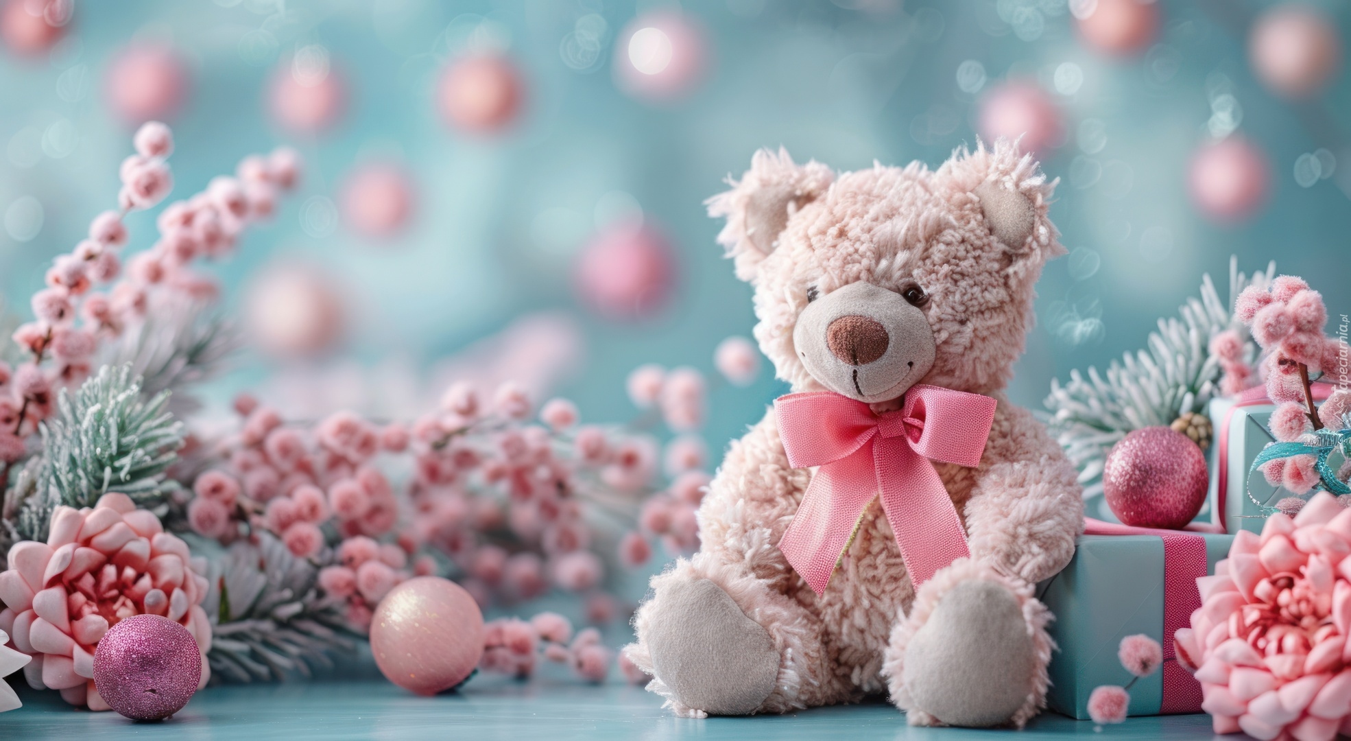Edytor tapety: Pluszowy miś z kokardą obok kwiatów i prezentów
