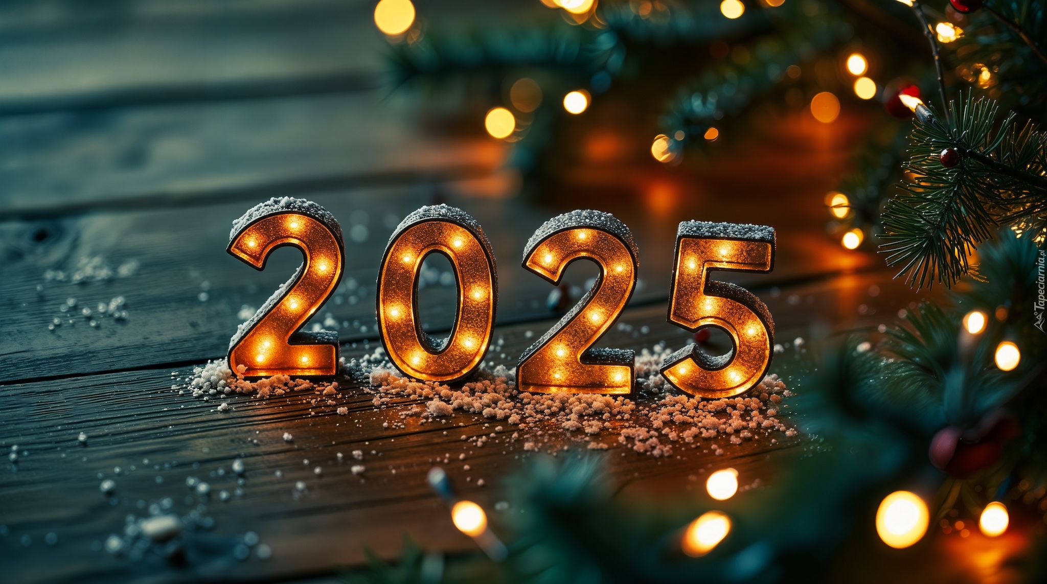 Edytor tapety: Podświetlone cyfry 2025 na deskach