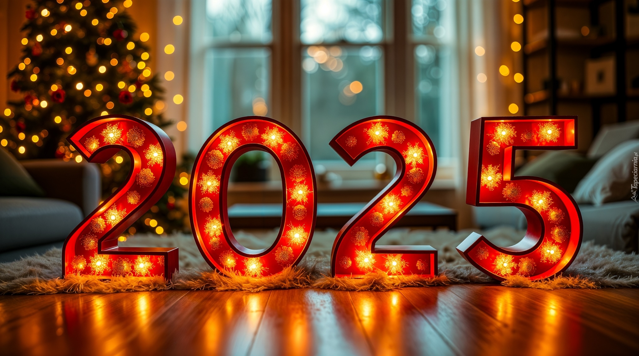 Edytor tapety: Podświetlone cyfry 2025 na dywaniku w pokoju