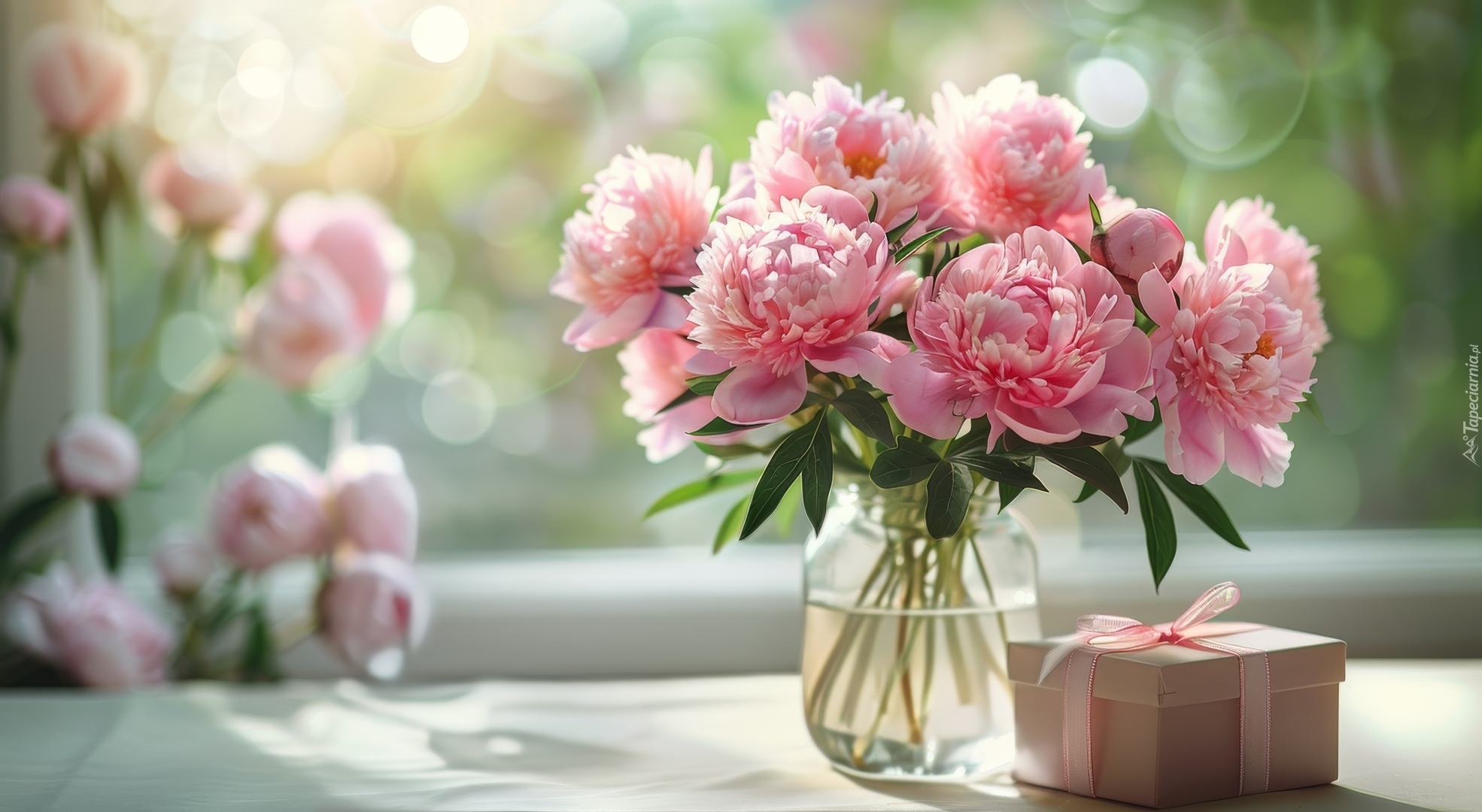 Edytor tapety: Różowe piwonie w szklanym wazonie obok prezentu
