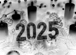 Edytor tapety: Zapalone czerwone świece na świerkowych gałązkach wokół daty 2025