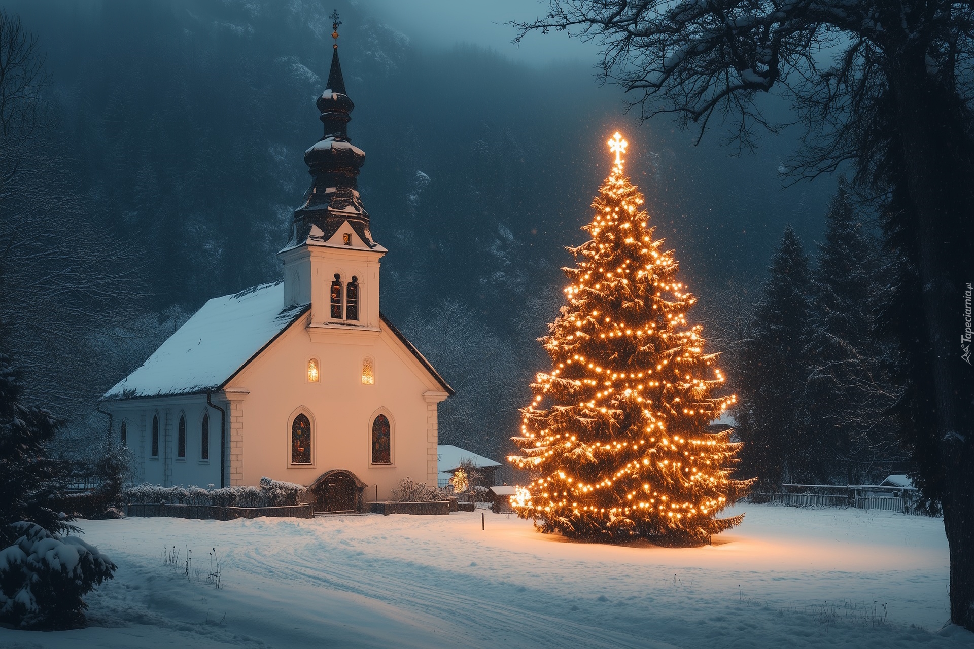 Edytor tapety: Rozświetlona choinka na śniegu przed kościołem