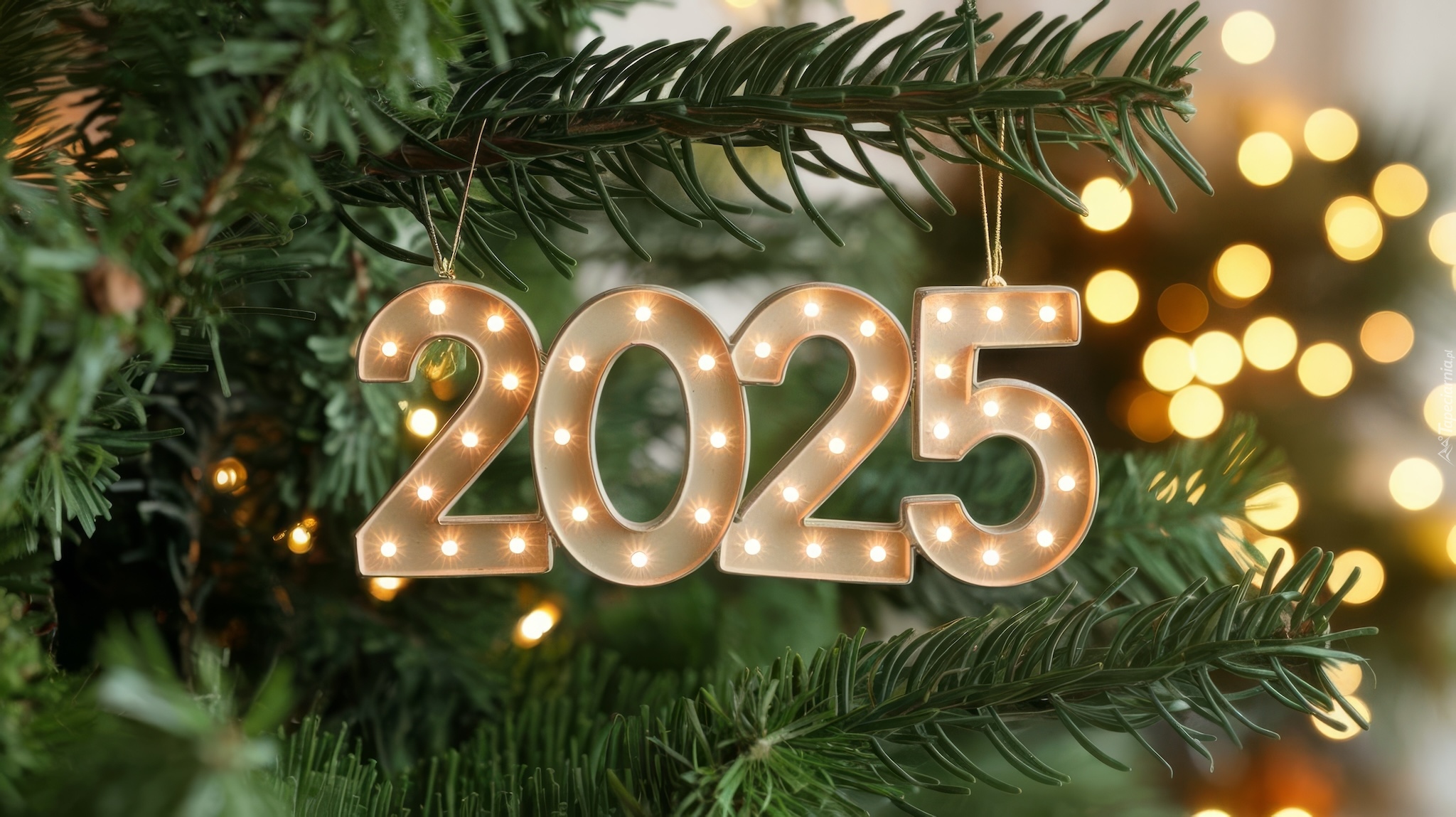 Edytor tapety: Podświetlone cyfry 2025 zawieszone na gałązce świerkowej