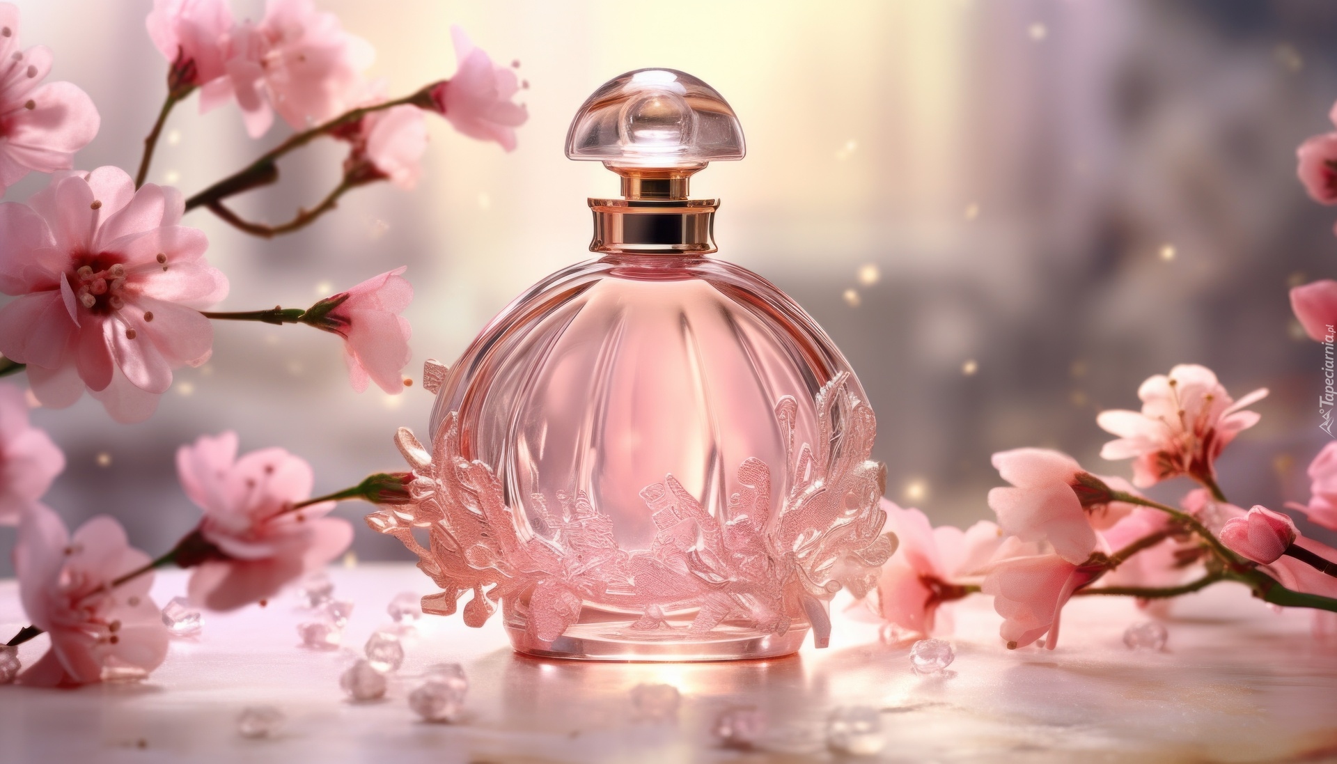 Edytor tapety: Flakon z perfumami obok różowych kwiatów