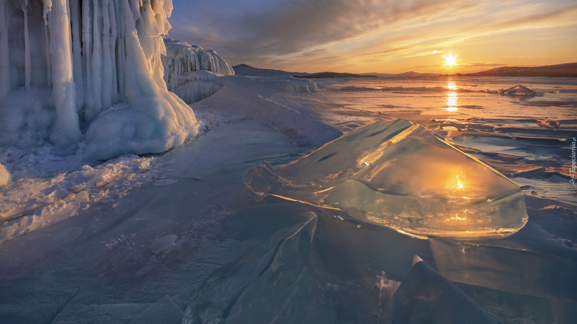 Edytor tapety: Odbicie zachodu słońca w bryle lodu na jeziorze