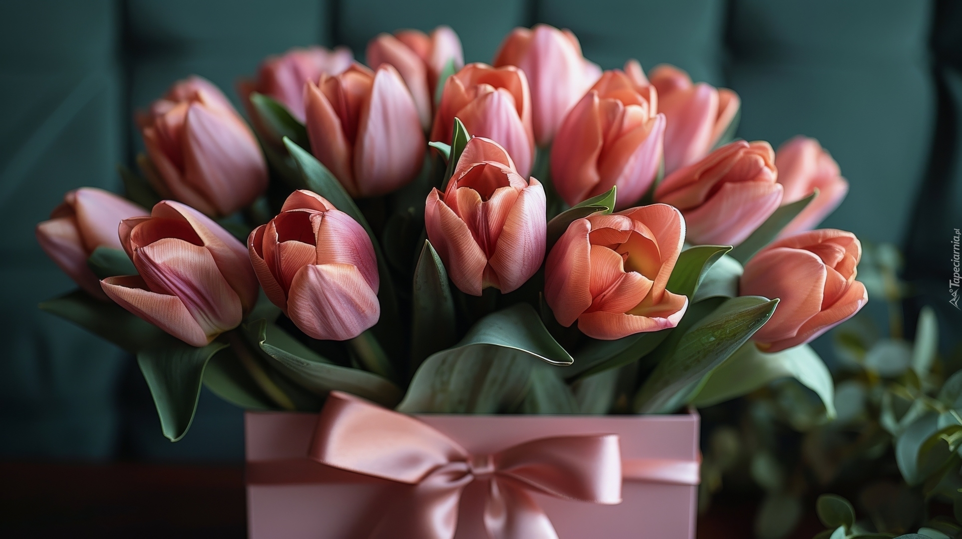 Edytor tapety: Bukiet tulipanów w różowym pudełku z kokardą