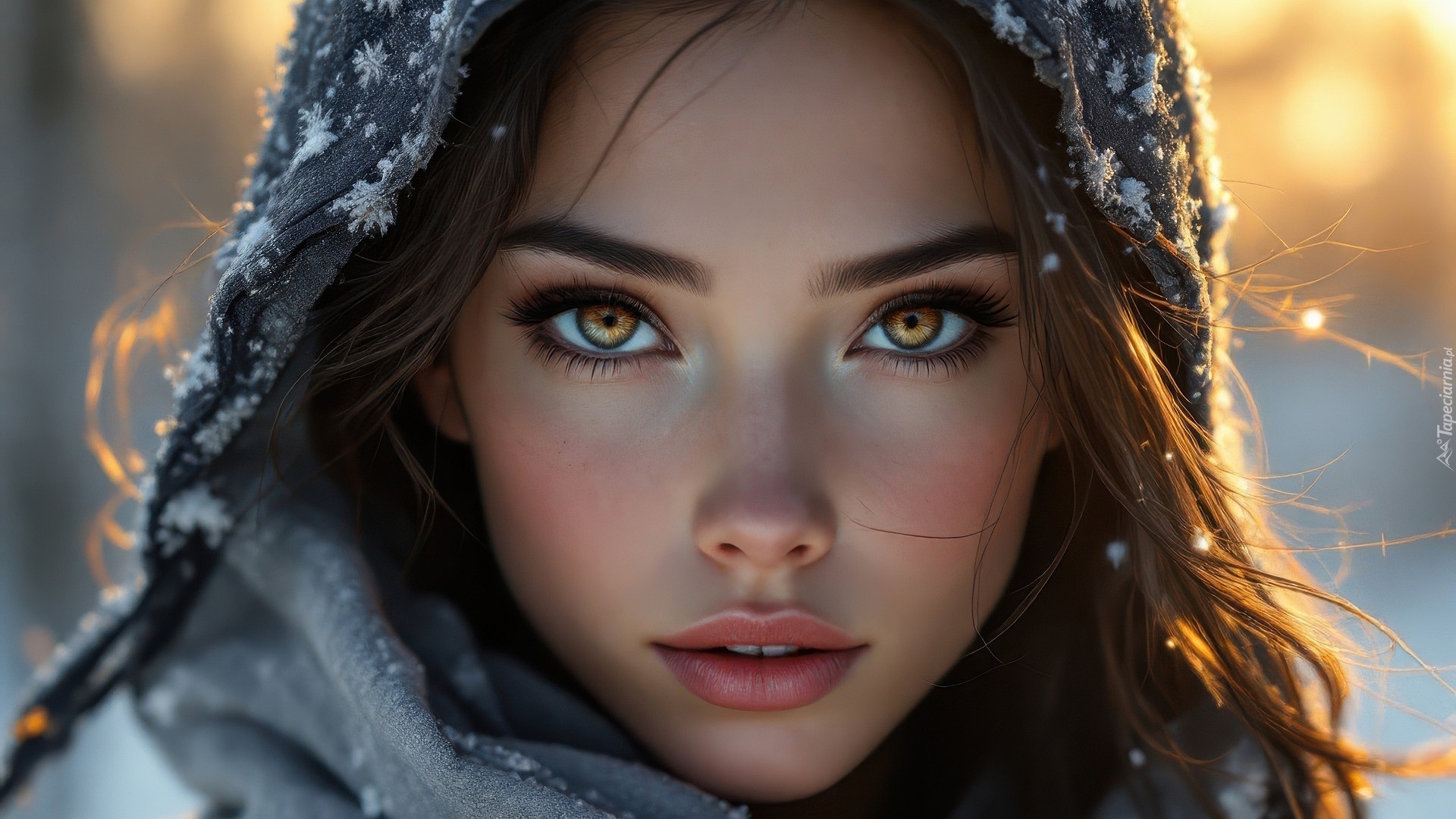 Edytor tapety: Twarz długowłosej dziewczyny w ośnieżonym kapturze