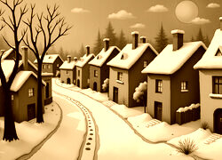 Edytor tapety: Drzewa i kolorowe domy po obu stronach ośnieżonej ulicy