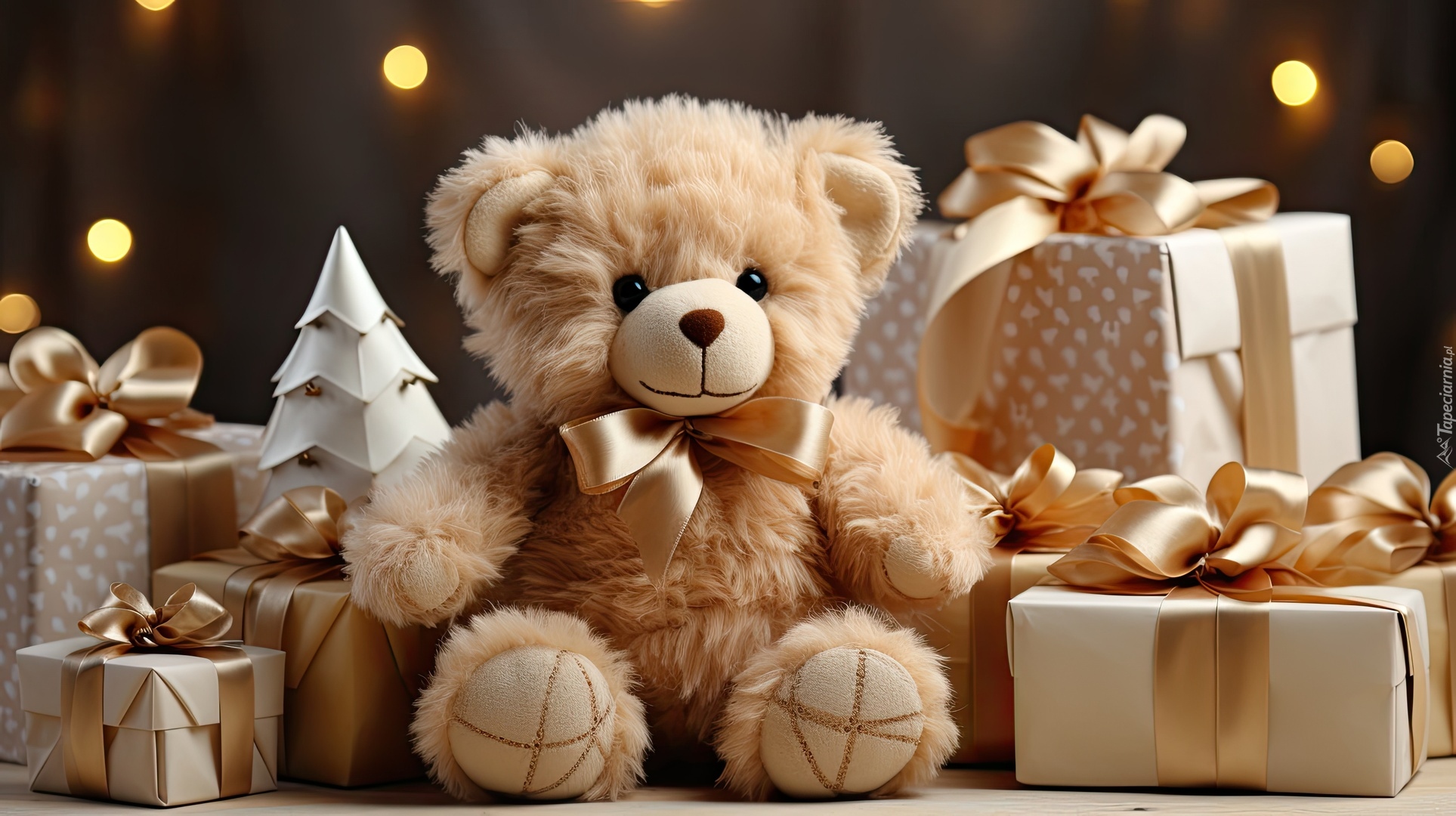 Edytor tapety: Pluszowy miś z kokardą między prezentami