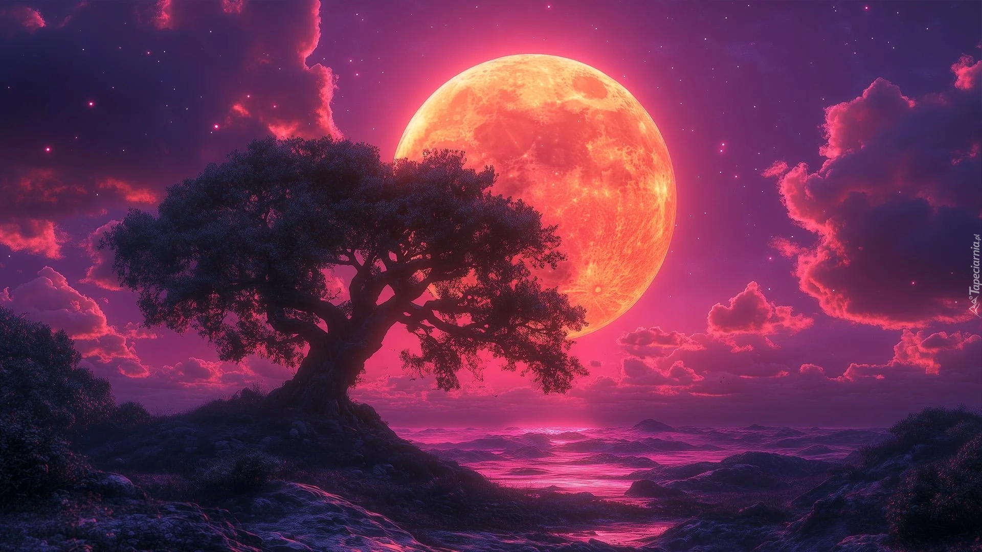 Edytor tapety: Drzewo na tle pomarańczowego księżyca