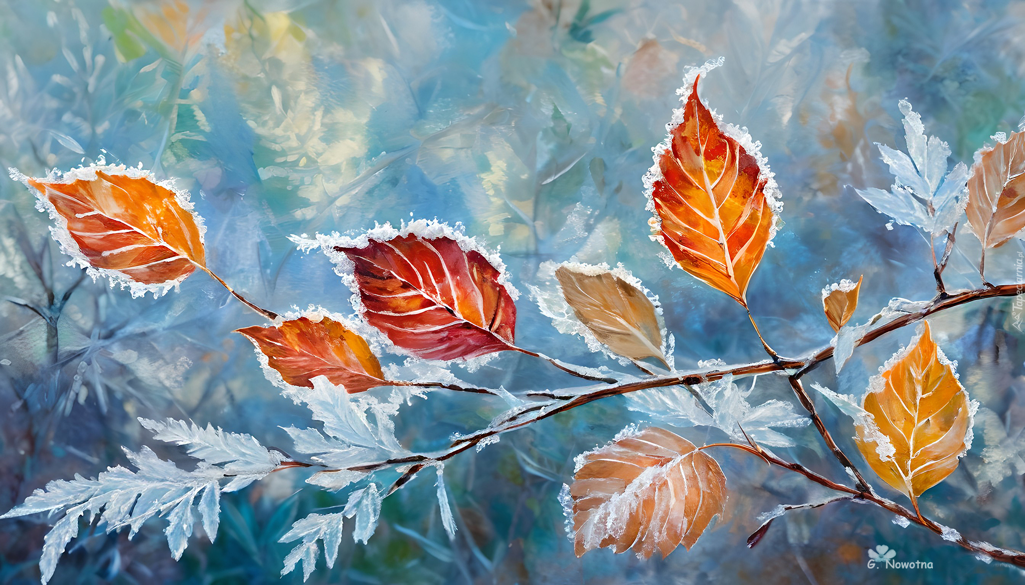 Edytor tapety: Oszronione pożółkłe liście na gałązkach
