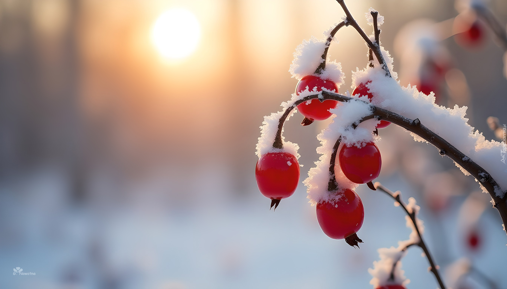 Edytor tapety: Czerwone owoce na ośnieżonej gałązce