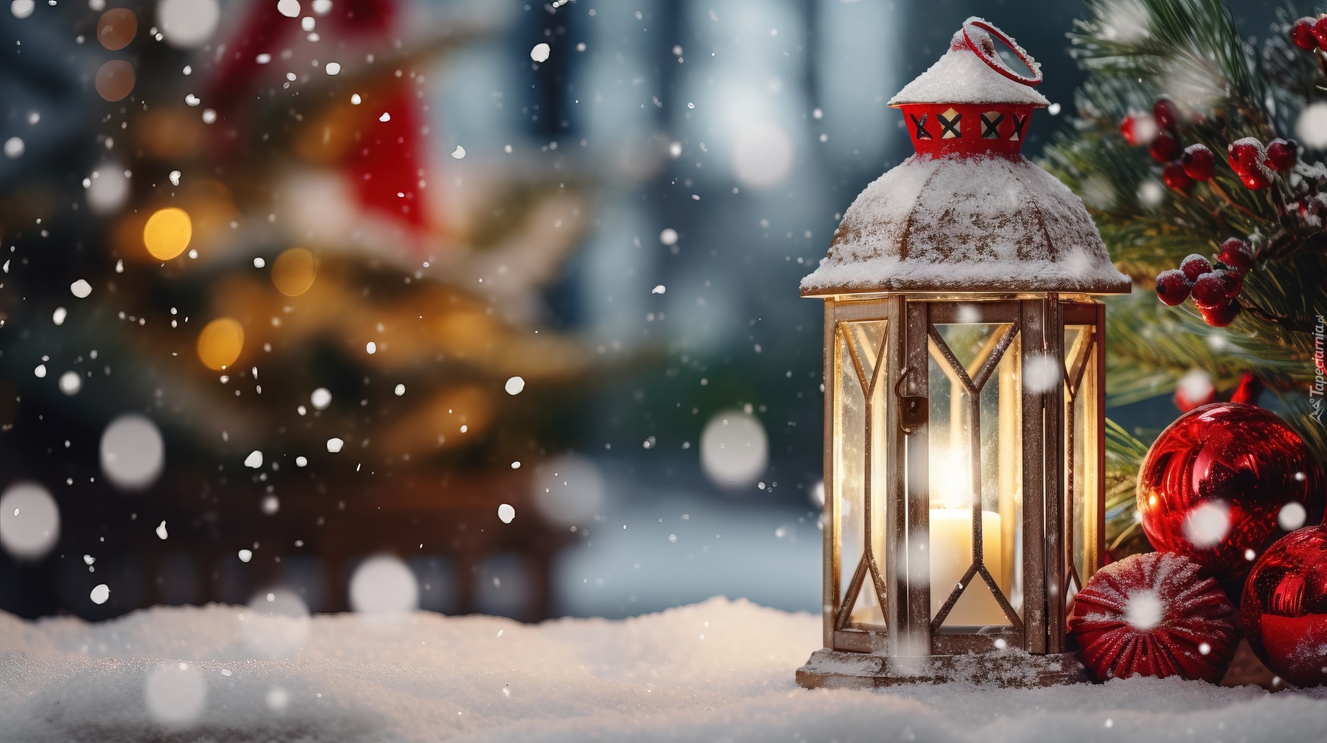 Edytor tapety: Ośnieżony zapalony lampion obok czerwonych bombek i choinki