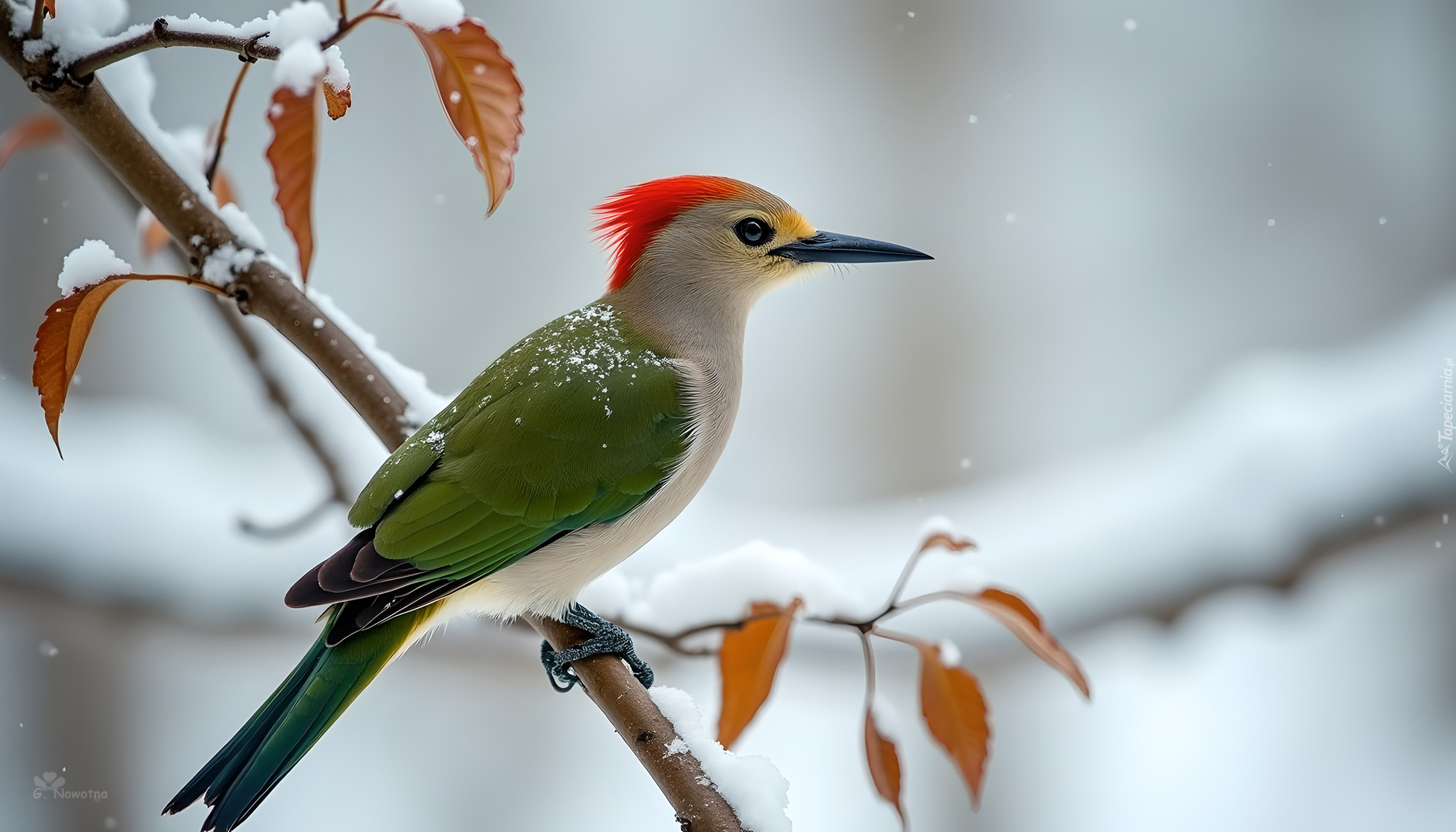 Edytor tapety: Dzięcioł zielony na ośnieżonej gałązce z jesiennymi liśćmi