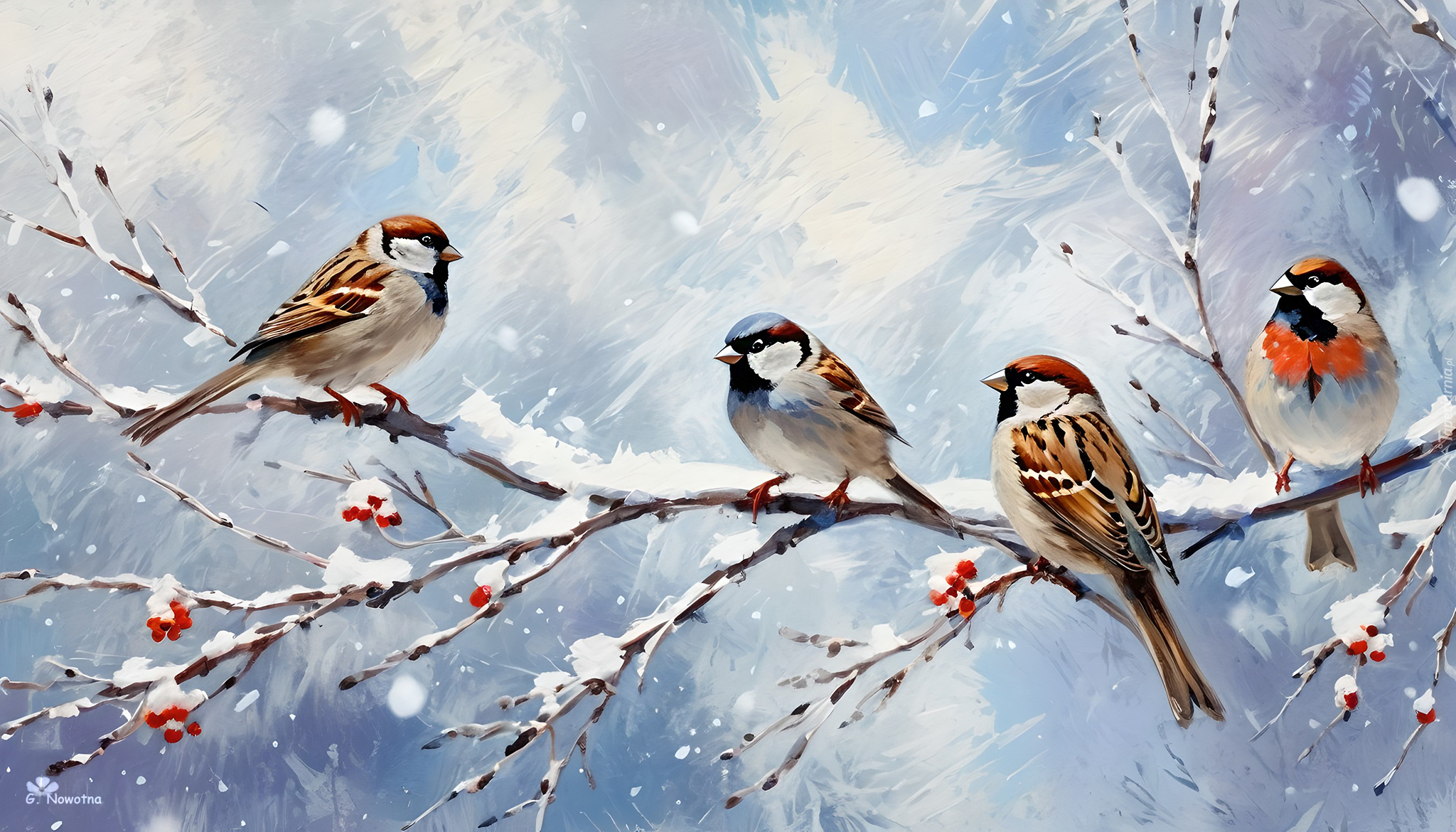 Edytor tapety: Cztery ptaki na ośnieżonej gałązce w grafice