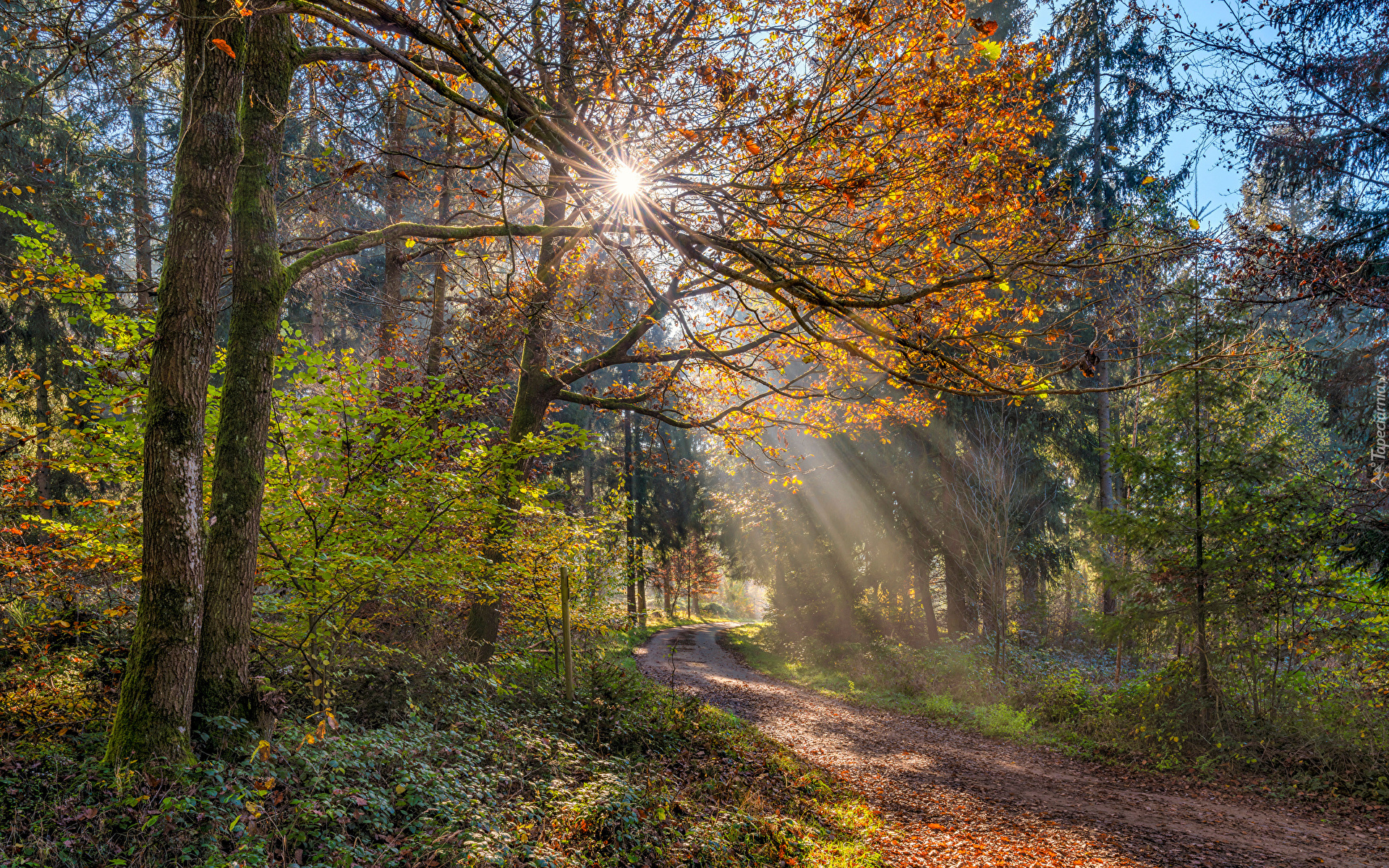 Edytor tapety: Droga w rozświetlonym lesie liściastym