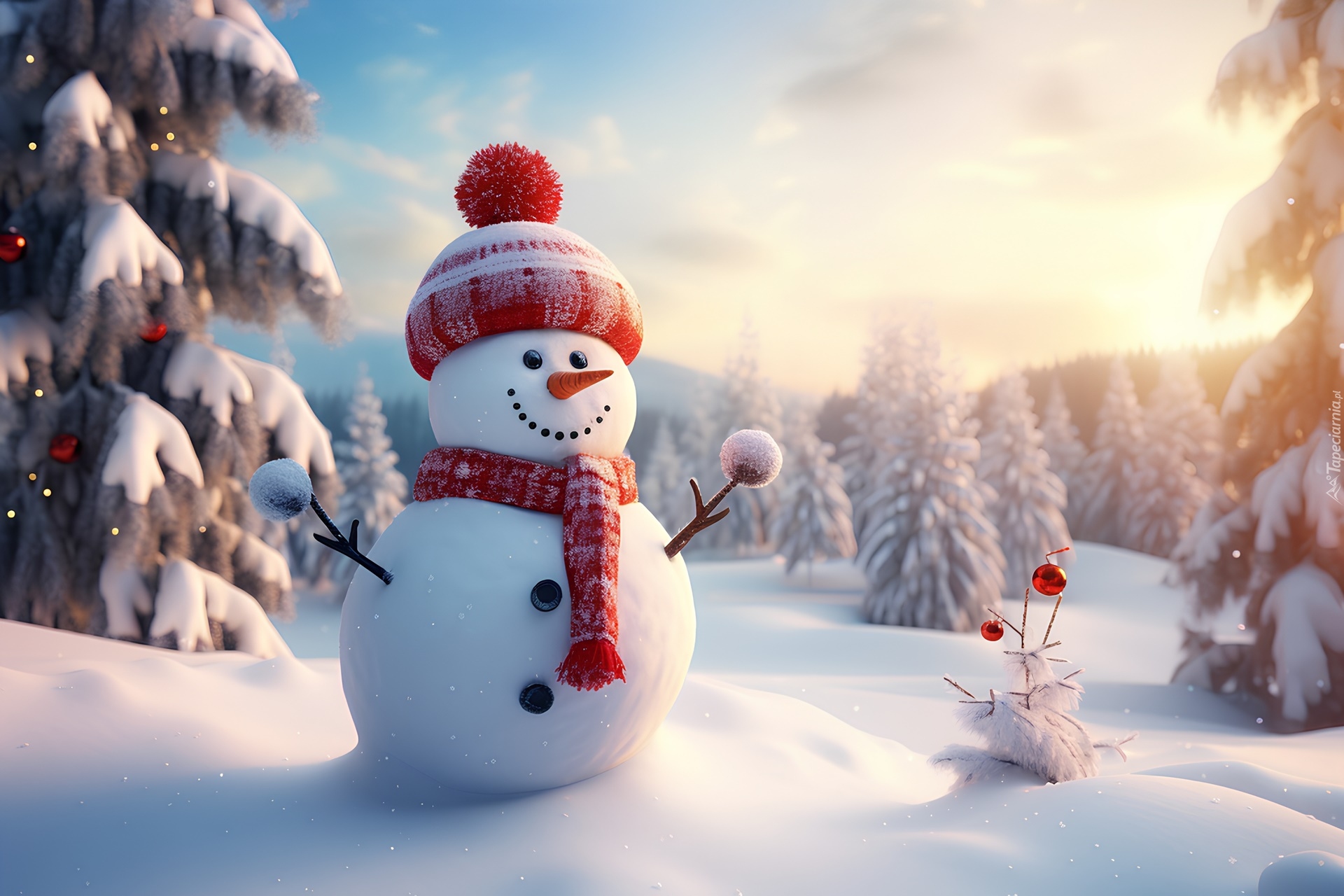 Edytor tapety: Bałwanek w czapce i szaliku obok ośnieżonych choinek